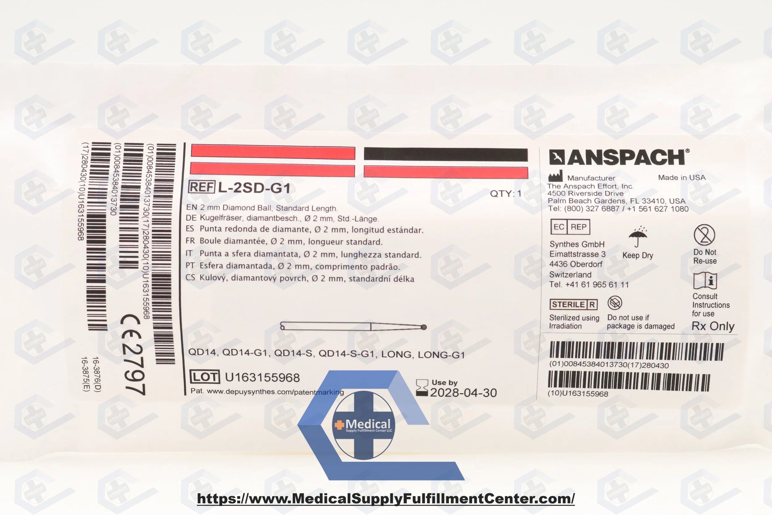 ANSPACH | L-2SD-G1 | IN-DATE | EACHES | 2mm, Diaomond Ball Standard Length, Use with QD14 Attachments, Sterile, Single Use, 1 Piece