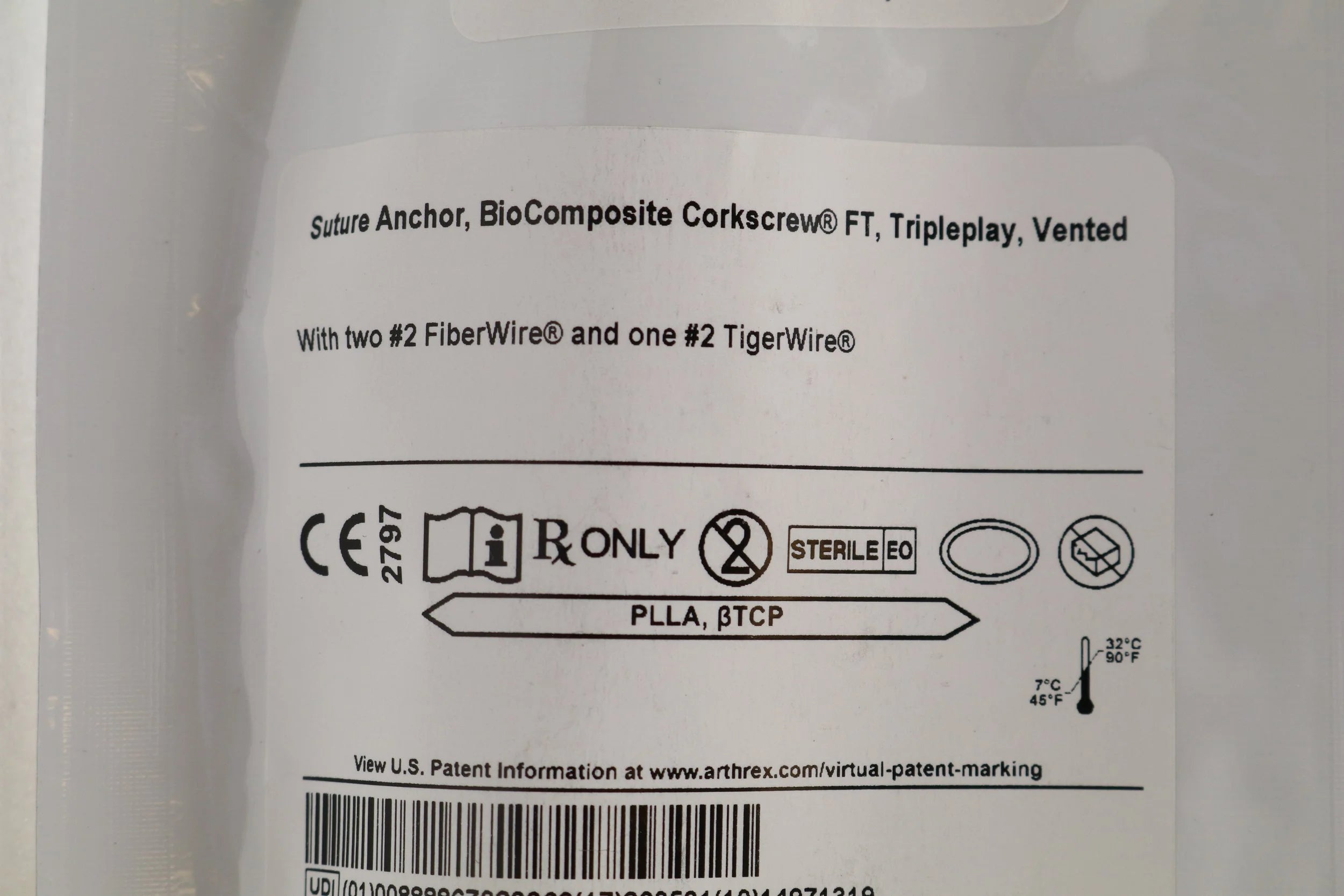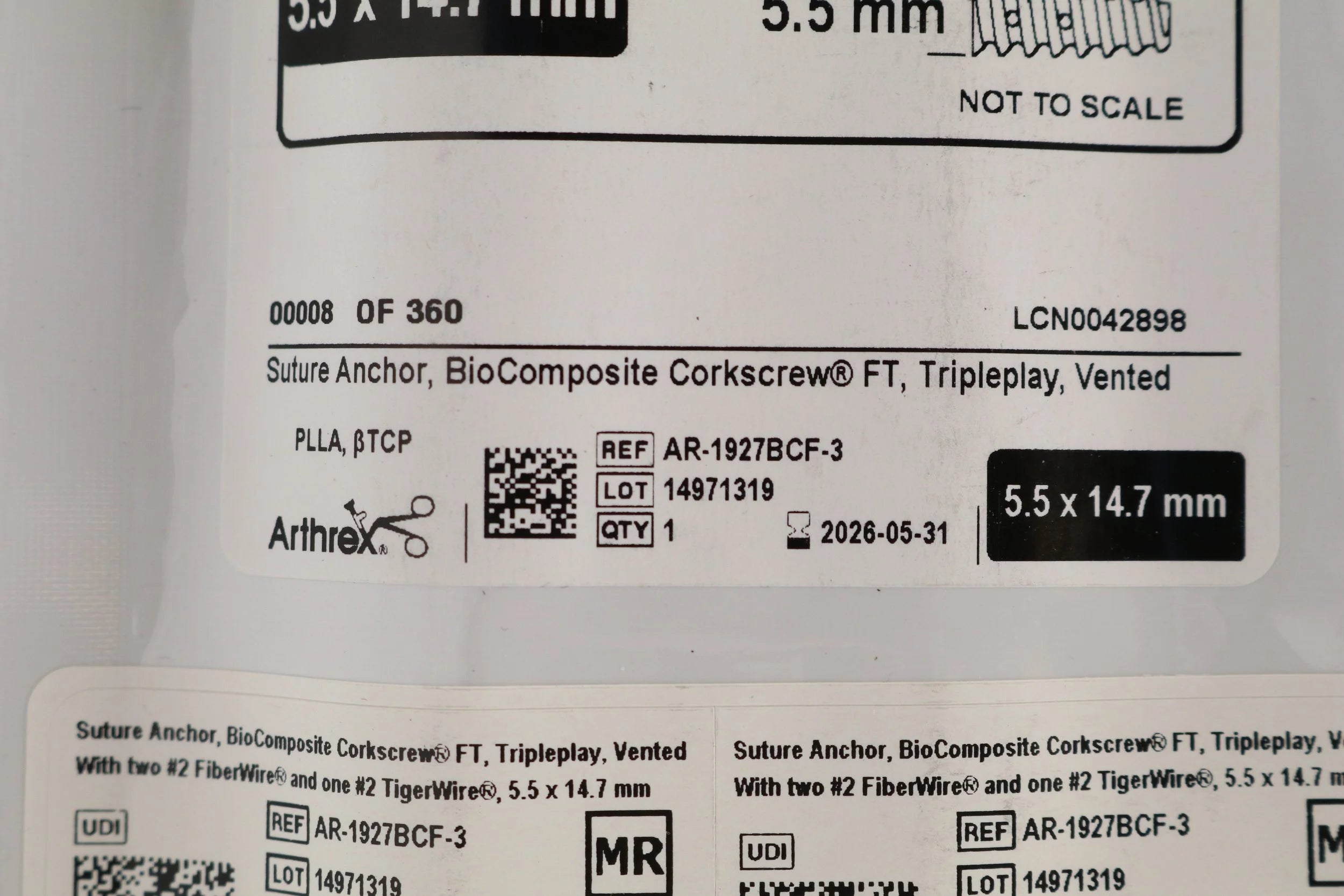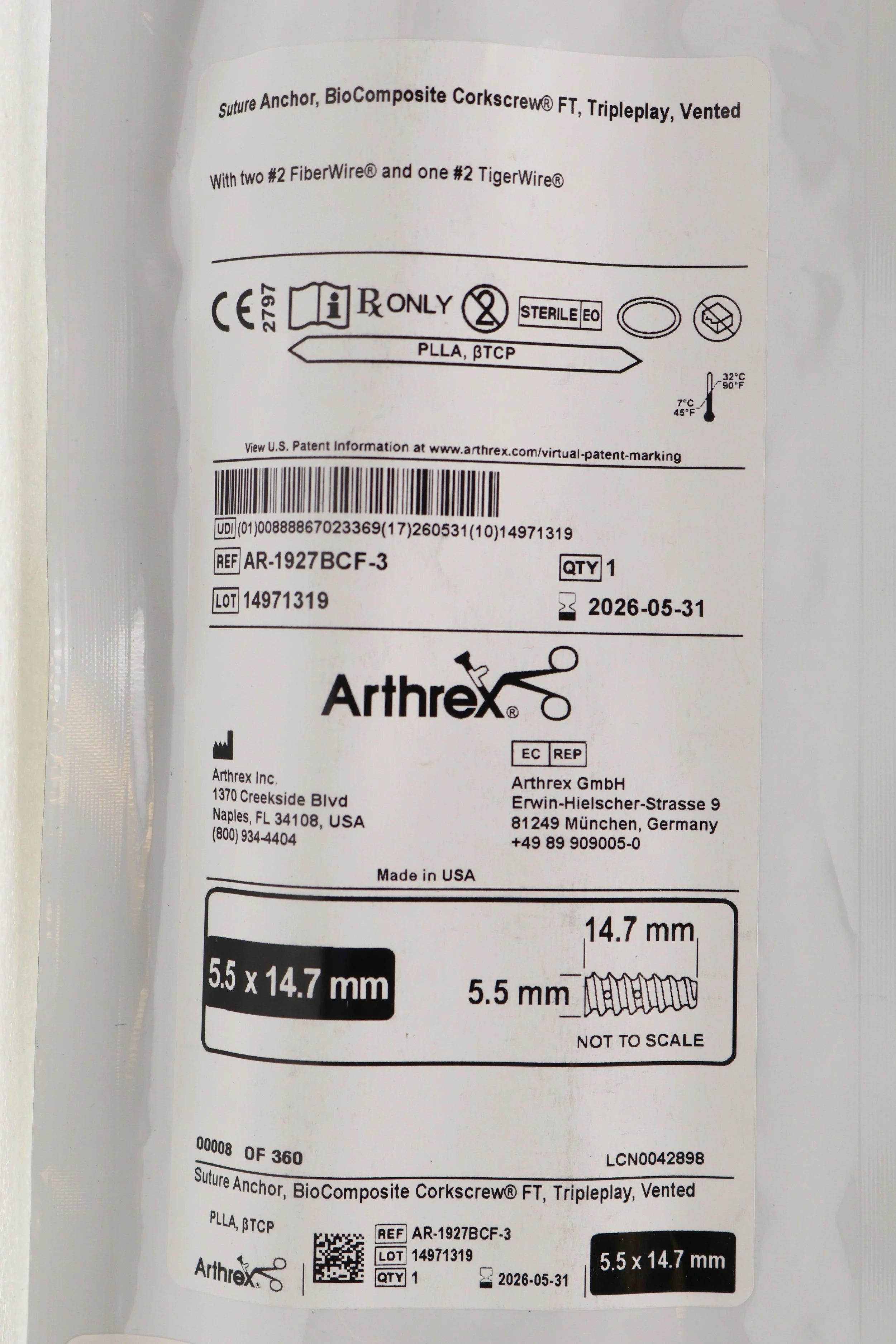 Arthrex AR-1927BCF-3 EACHES BioComposite Corkscrew FT Suture Anchor, Triple Play w/FiberWire + TigerWire 5.5mm x 14.7mm