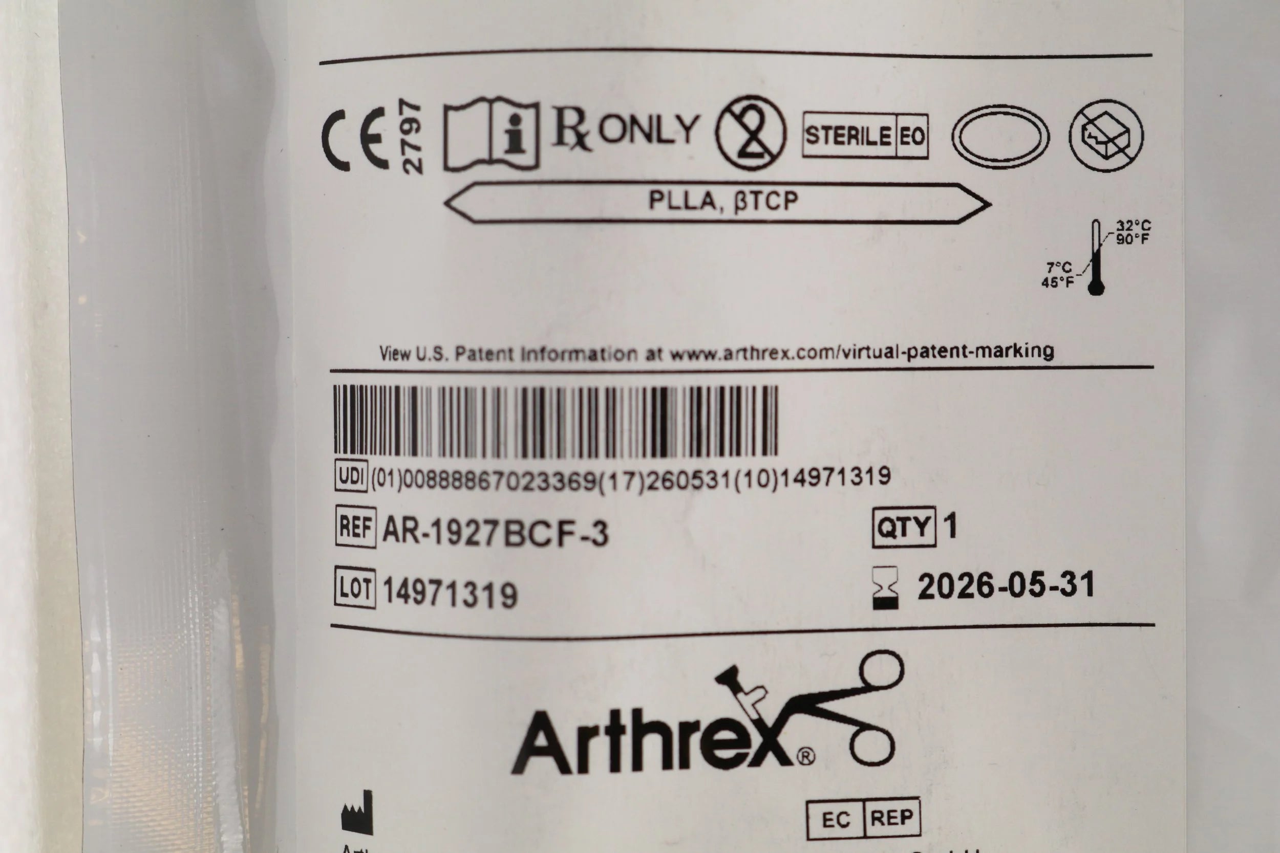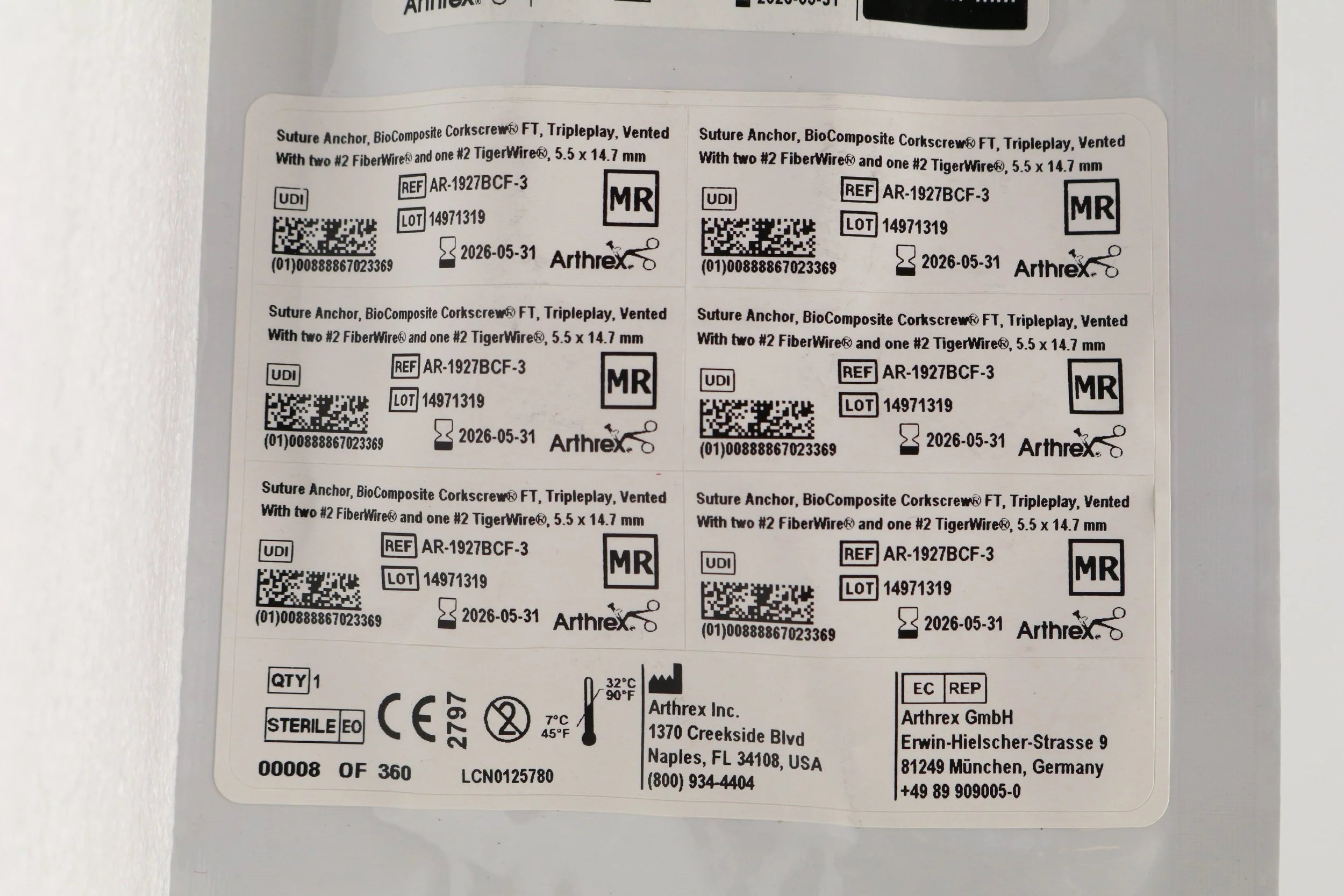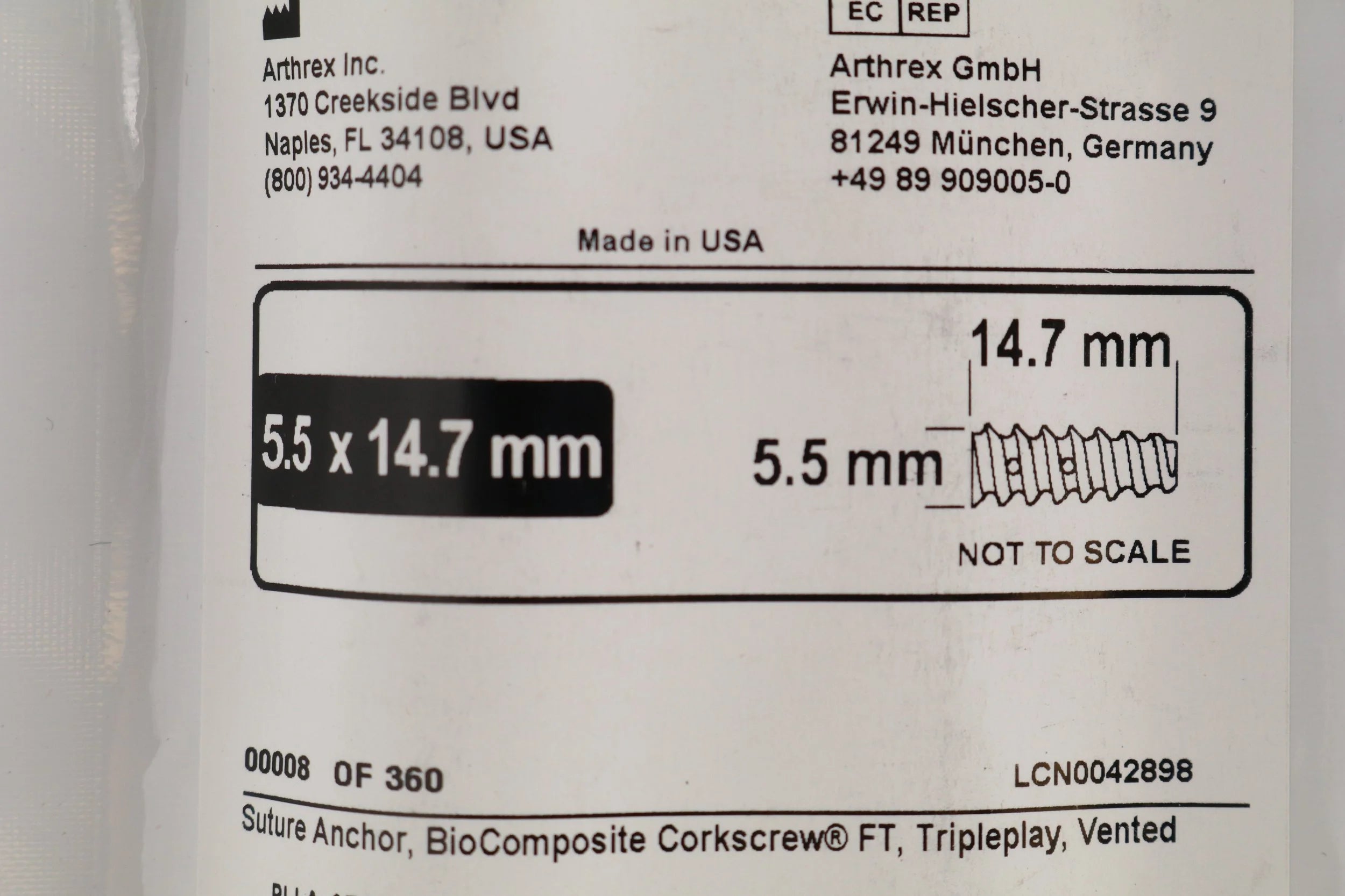 Arthrex AR-1927BCF-3 EACHES BioComposite Corkscrew FT Suture Anchor, Triple Play w/FiberWire + TigerWire 5.5mm x 14.7mm