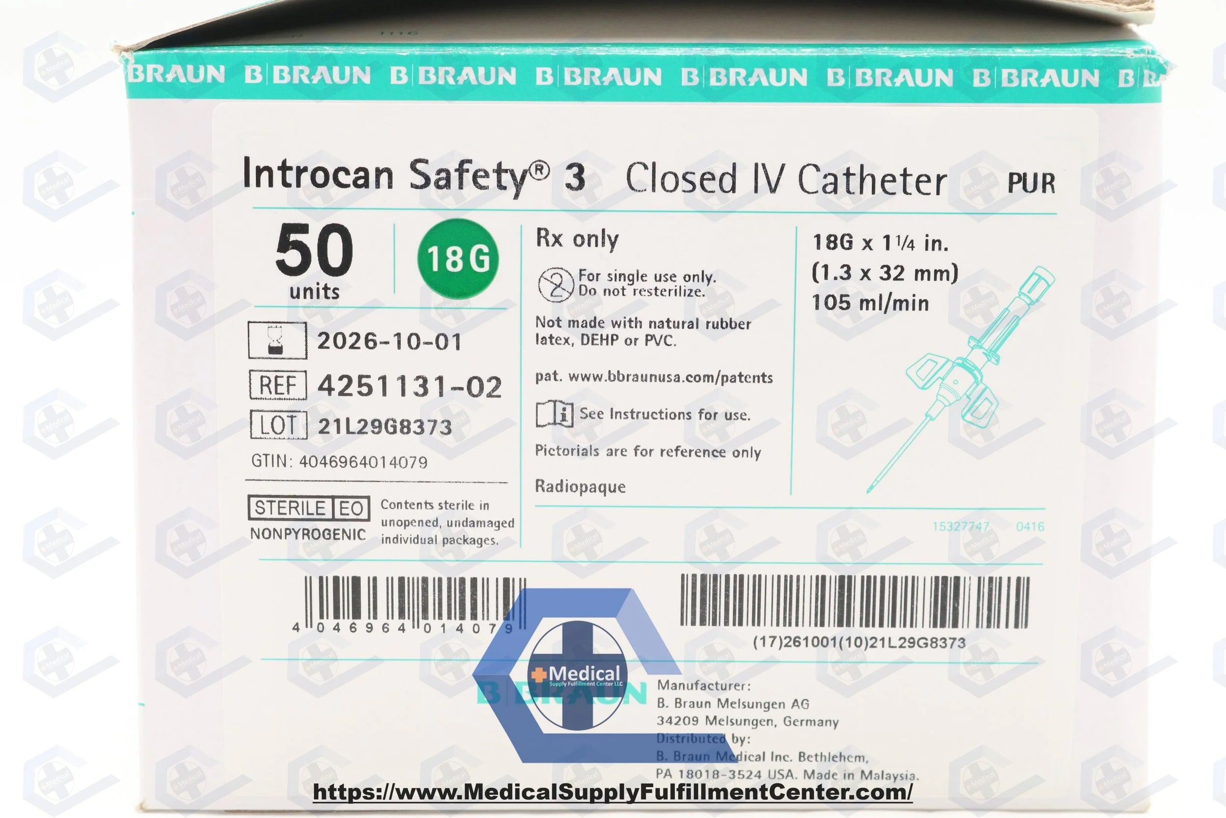 Braun | 4251131-02 | IN-DATE | BOX OF 50 | Introcan Safety 3 Closed IV Catheter 18G x 1.25" PUR, Winged