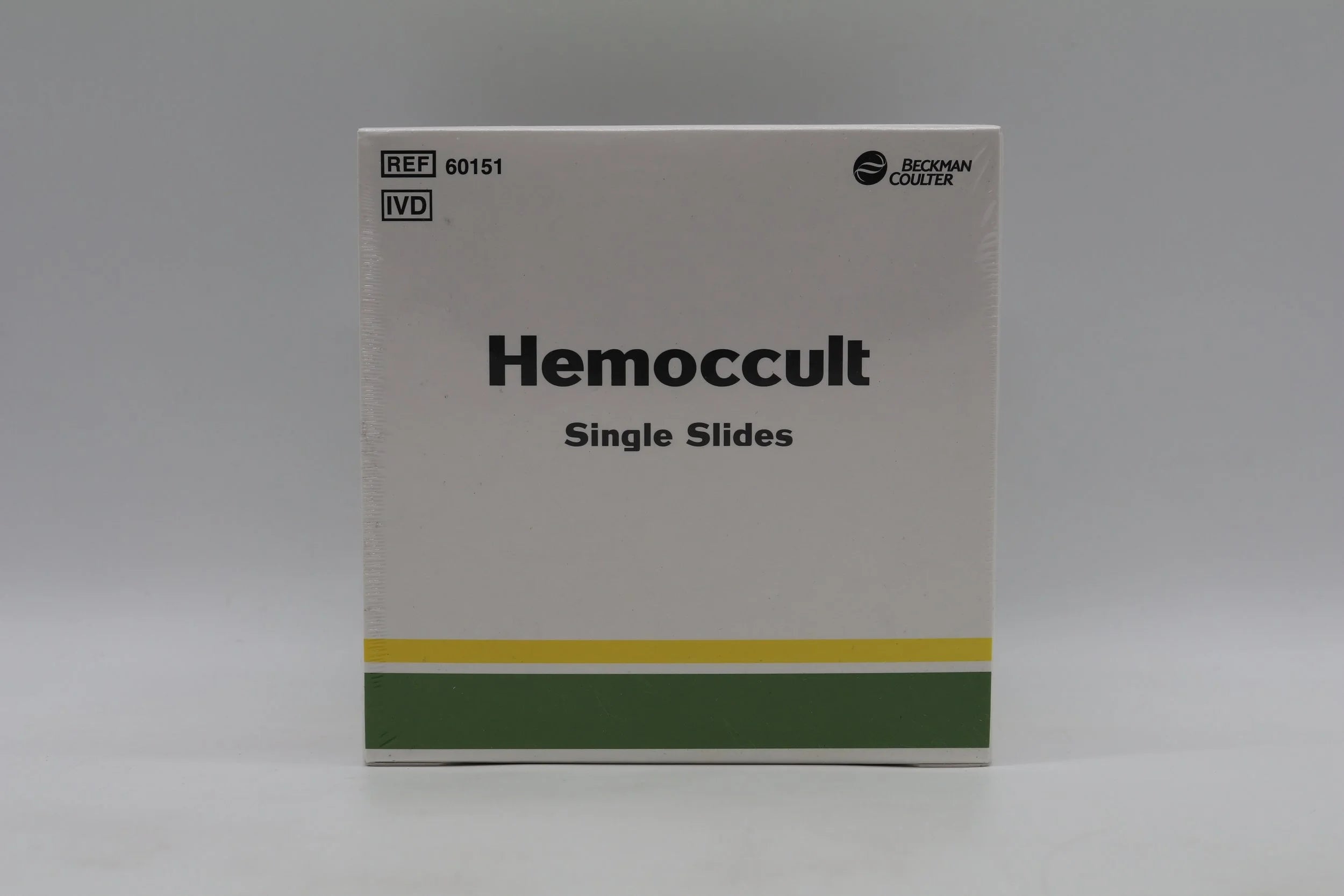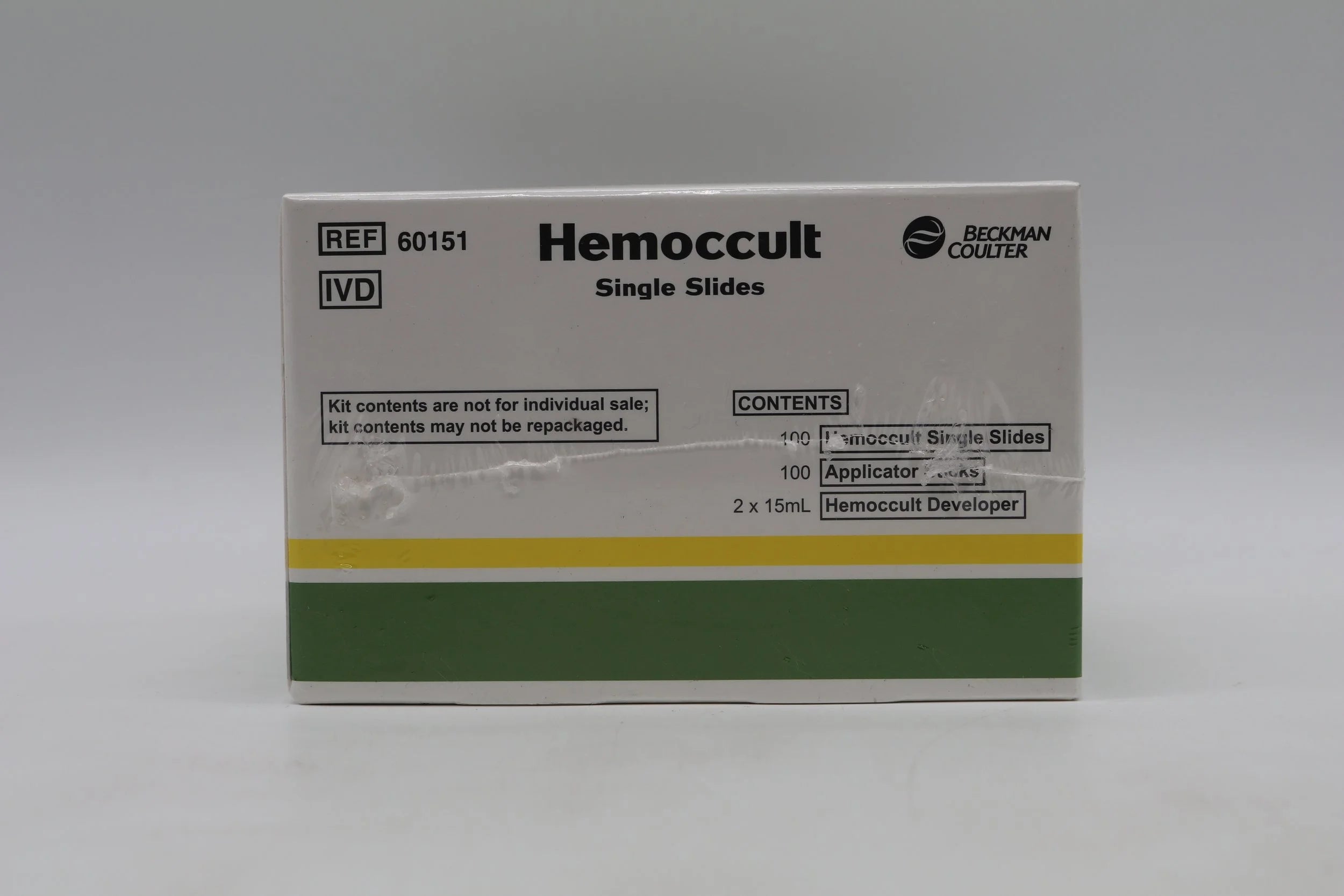 BECKMAN COULTER | 60151 | IN-DATE | BOX OF 100 | Guaiac-based fecal occult blood test kit: 100 single slides + applicators + 2 × 15 mL developer bottles, CLIA-waived.
