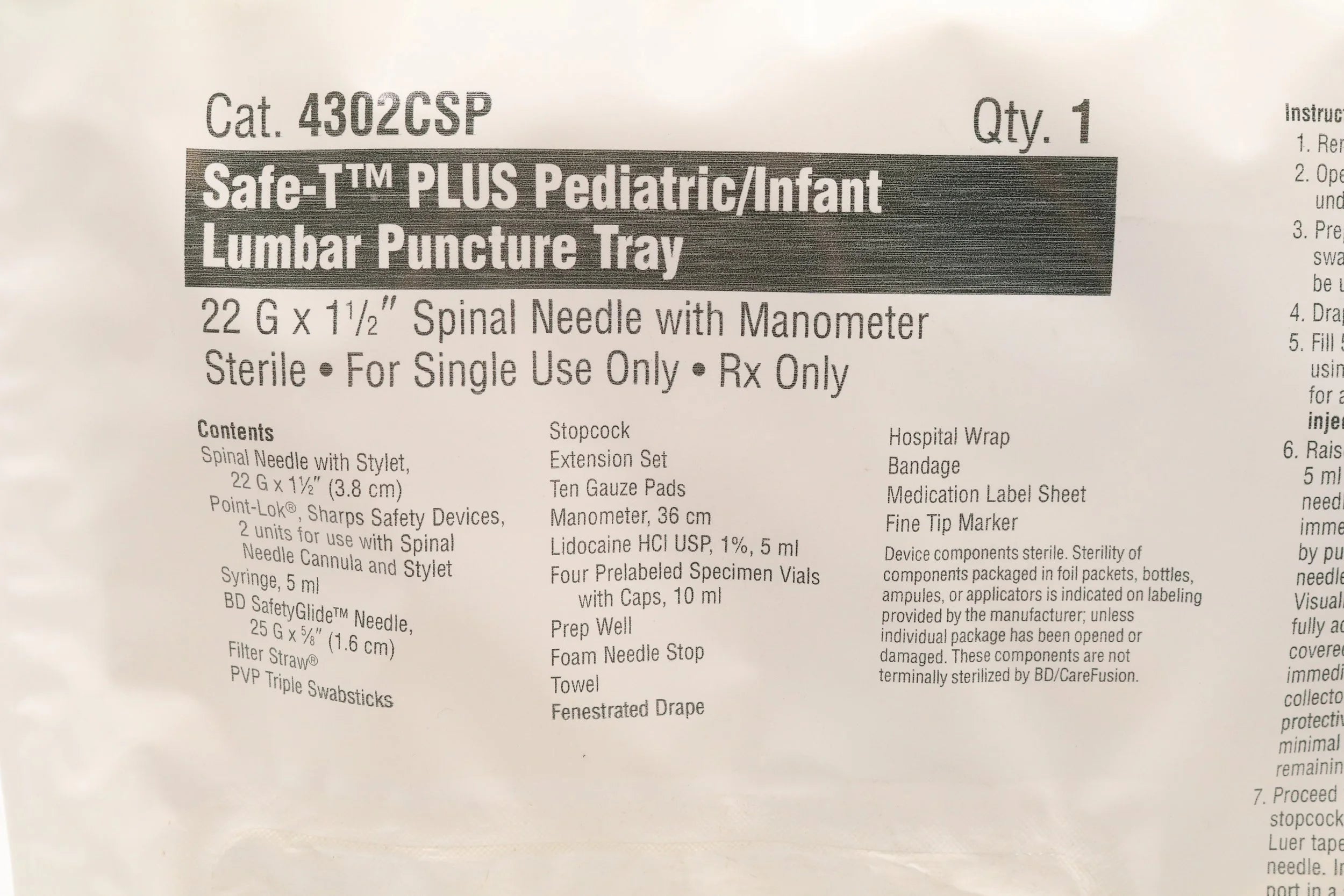 CAREFUSION 4302CSP SHORT DATE Safe-T Plus Pediatric Lumbar Puncture Tray BOX OF 10