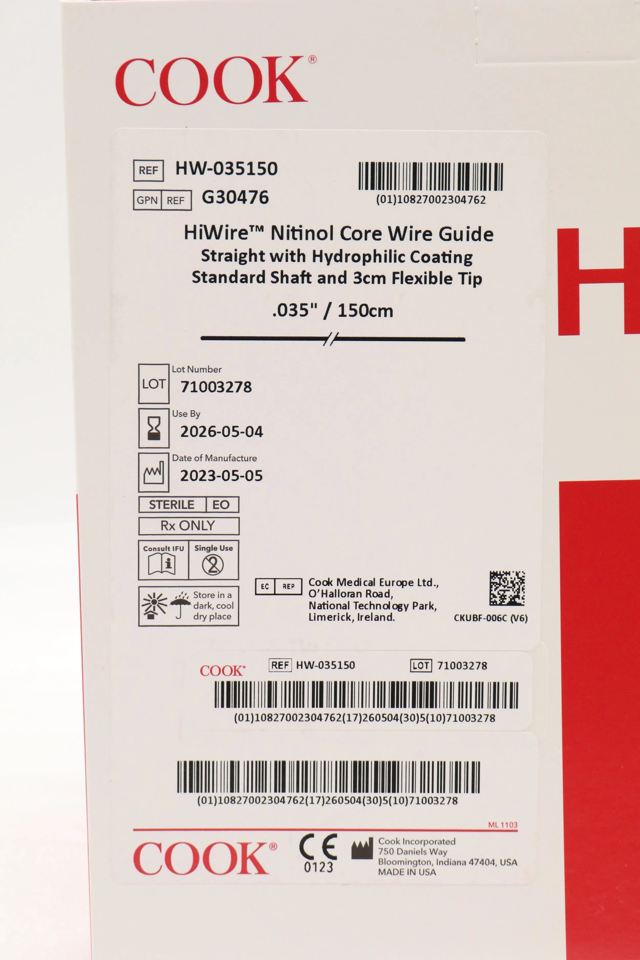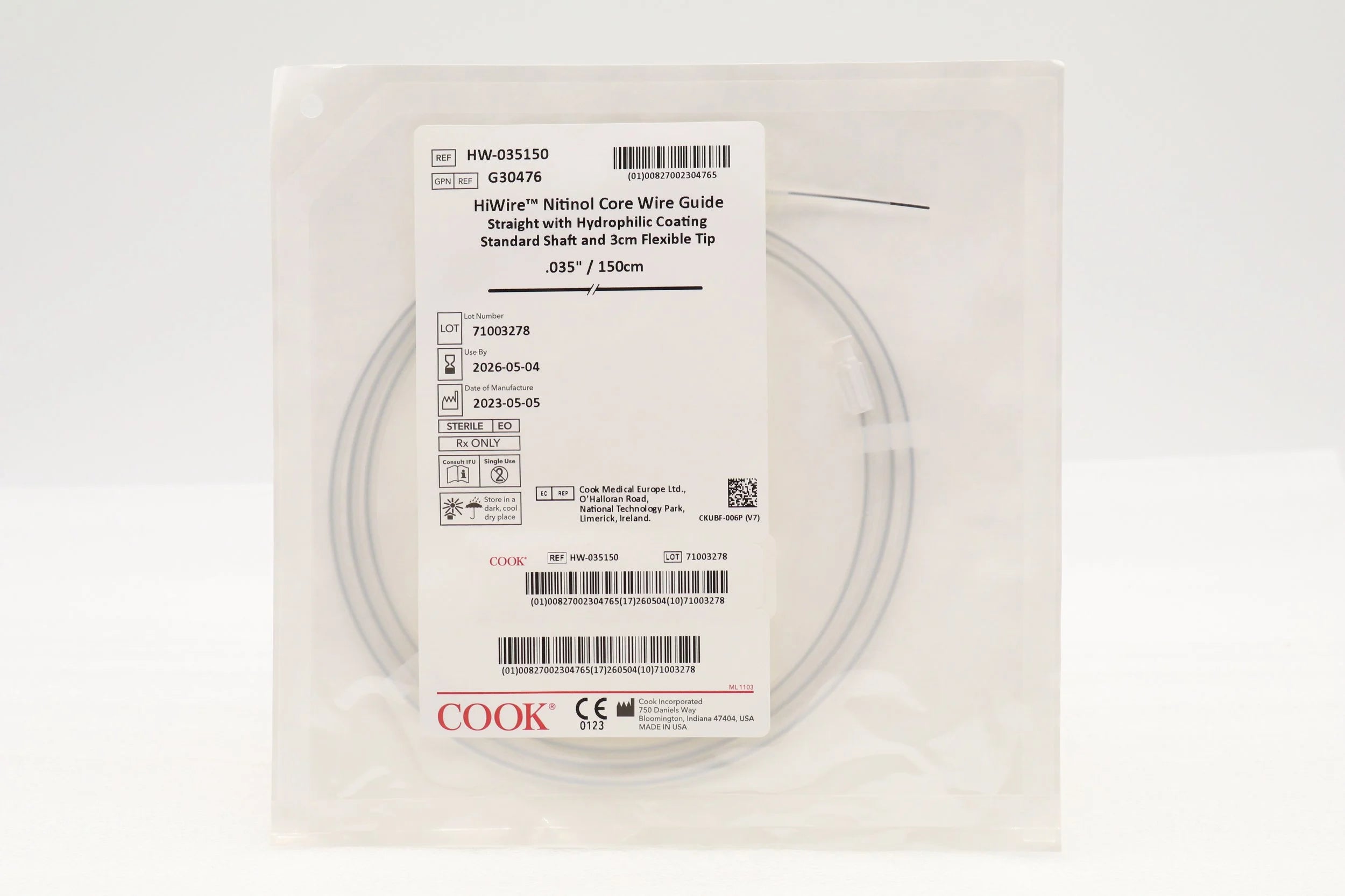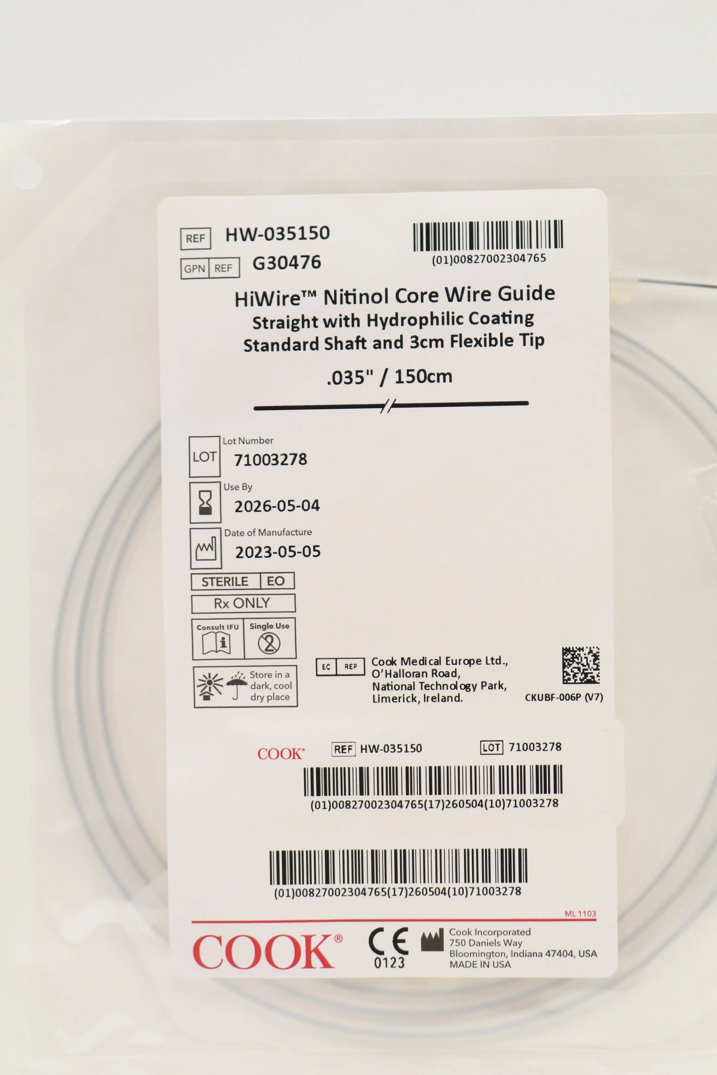 COOK MEDICAL | G30476 | IN-DATE | Box of 5 | HW-035150 HI WIRE NITINOL CORE WIRE GUIDE WITH HYDROPHILLIC COATING .035" X 150 CM