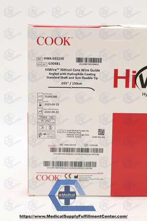 COOK MEDICAL | G30481 | SHORTDATE | EACHES | HiWire Wire Guide, Hydrophilic, Standard Body, 3 cm Angled, 0.035" x 150 cm