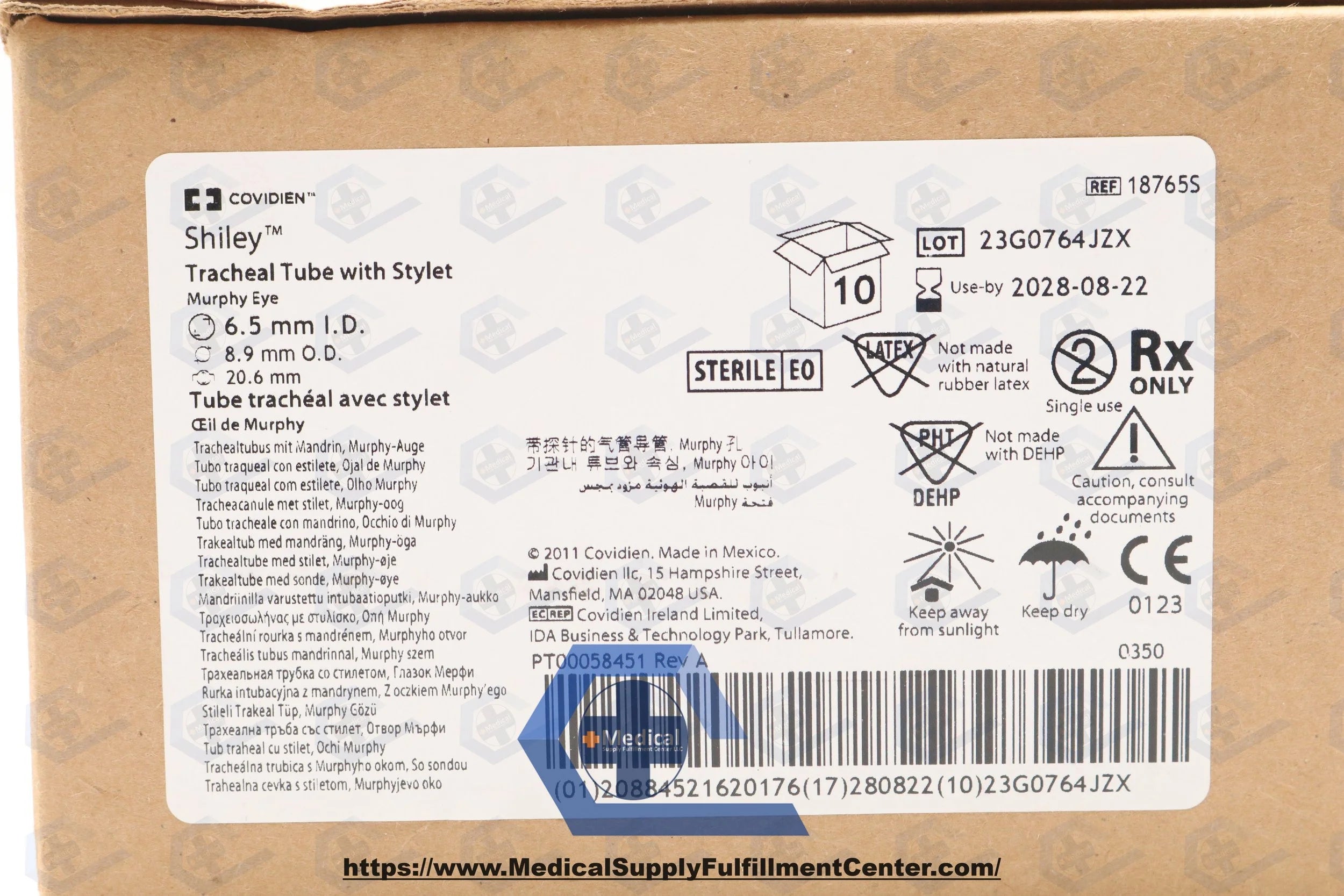 COVIDIEN | 18765S | IN-DATE | BOX OF 10 | Endotracheal Tube, 6.5 ID x 8.9 mm OD, with TaperGuard Cuff, Murphy Eye with Preloaded Stylet, Latex-Free, Sterile, Single-Use