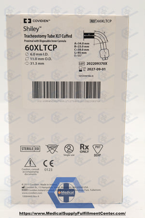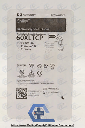 COVIDIEN | 60XLTCP | IN-DATE | BOX OF 1 | SHILEY TRACHEOSTOMY TUBE XLT CUFFED PROXIMAL WITH DISPOSABLE INNER CANNULA, 6.0MM I.D. X 11.0MM O.D. X 31.3MM, 90 DEGREE
