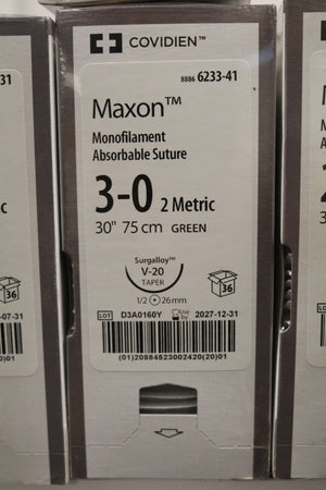 COVIDIEN | 6233-41 | IN-DATE | BOX OF 36 | Maxon AMonofilament Absorbable Suture 3-0 2 Metric 30" 75cm GREEN