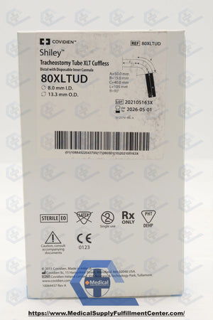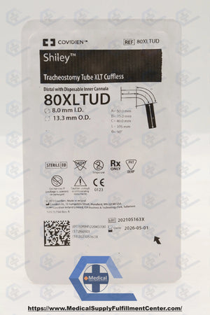 COVIDIEN | 80XLTUD | IN-DATE | BOX OF 1 | Tracheostomy Tube, 8 ID x 13.3 OD x 105 mm Length, 50 mm Distal Length, 15 mm Proximal Length, 40 mm Radial Length, Cuffless
