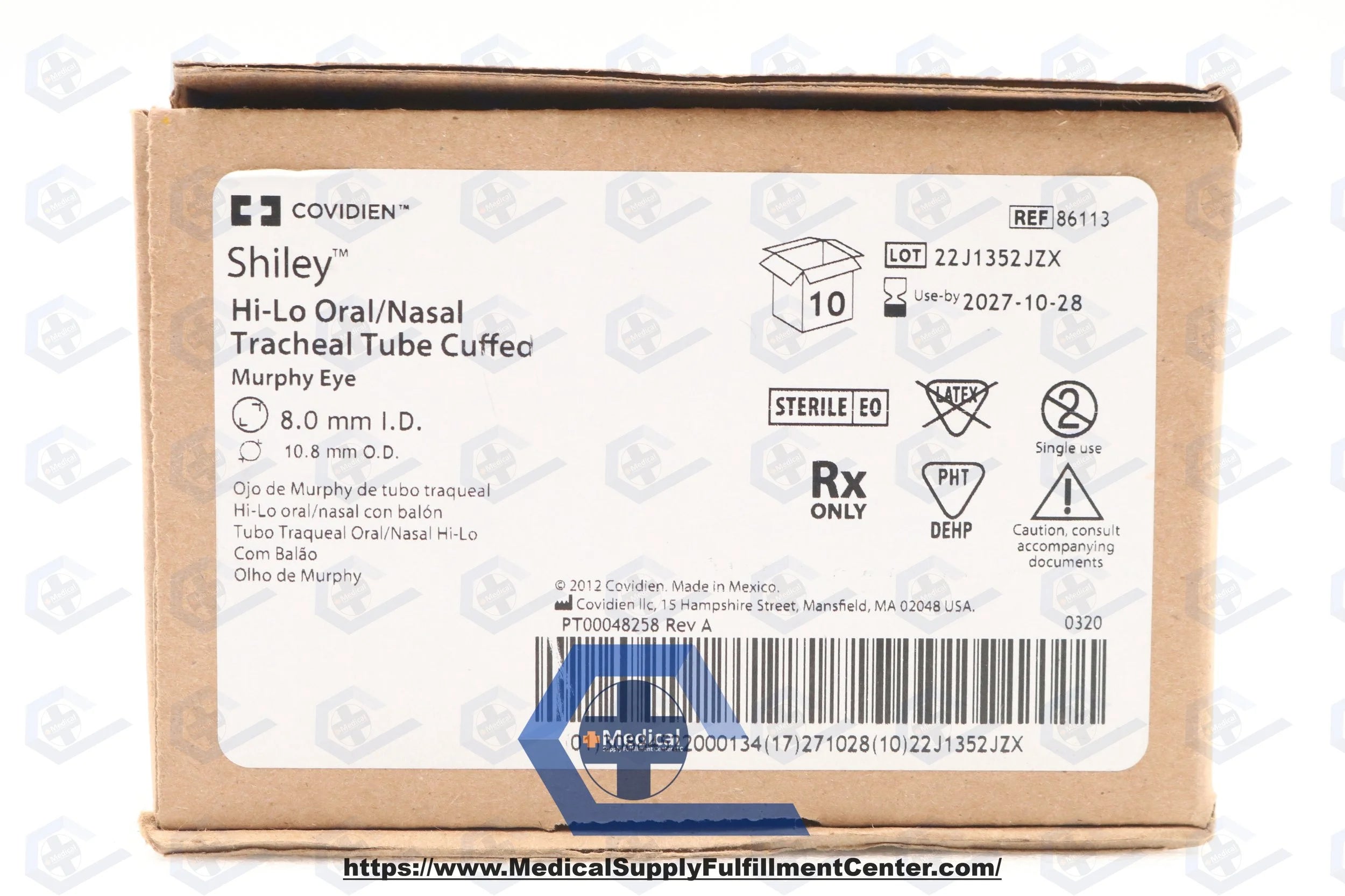 Covidien | 86113 | IN-DATE | Box of 10 | Shiley Hi-Lo Oral/Nasal Tracheal Tube Cuffed