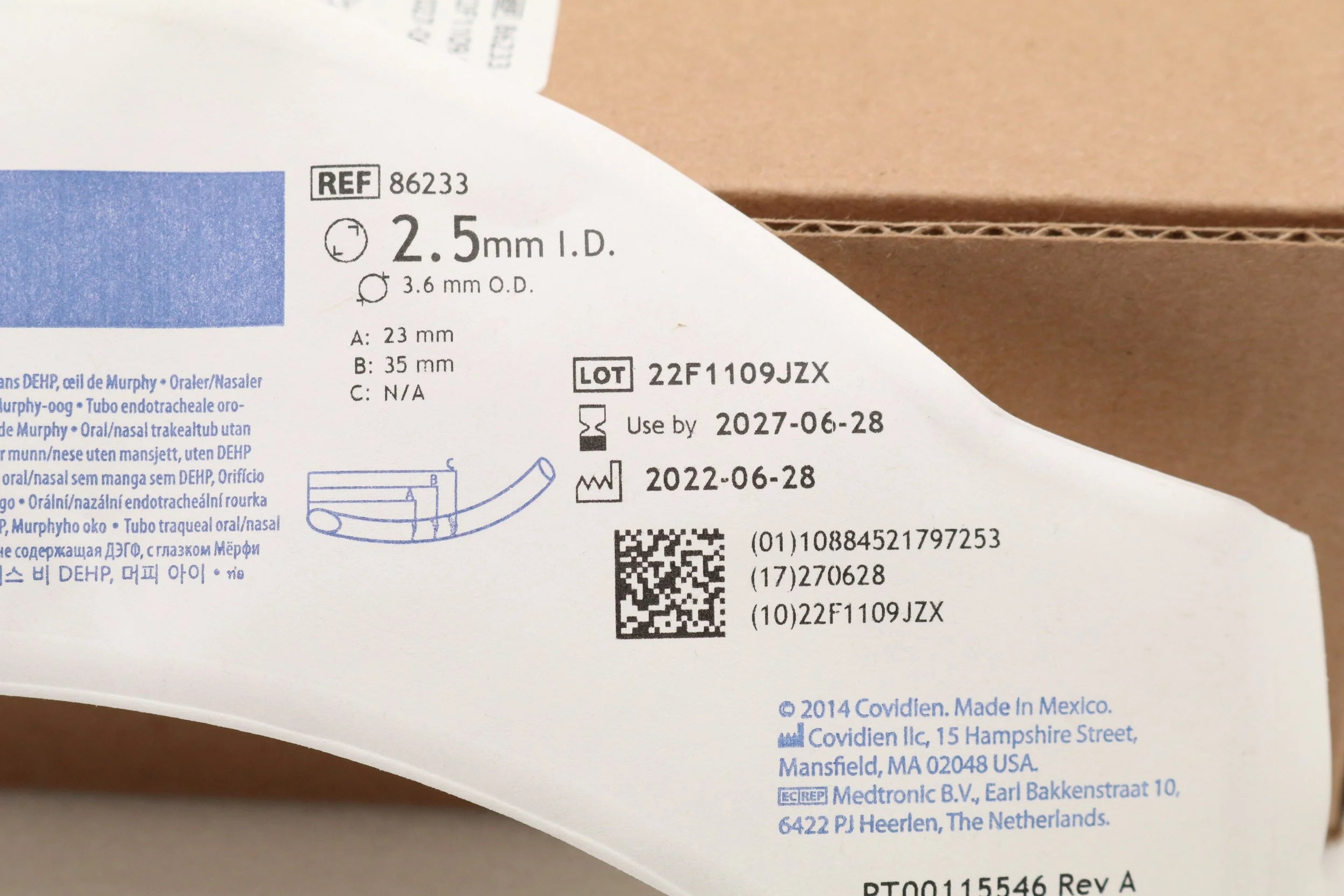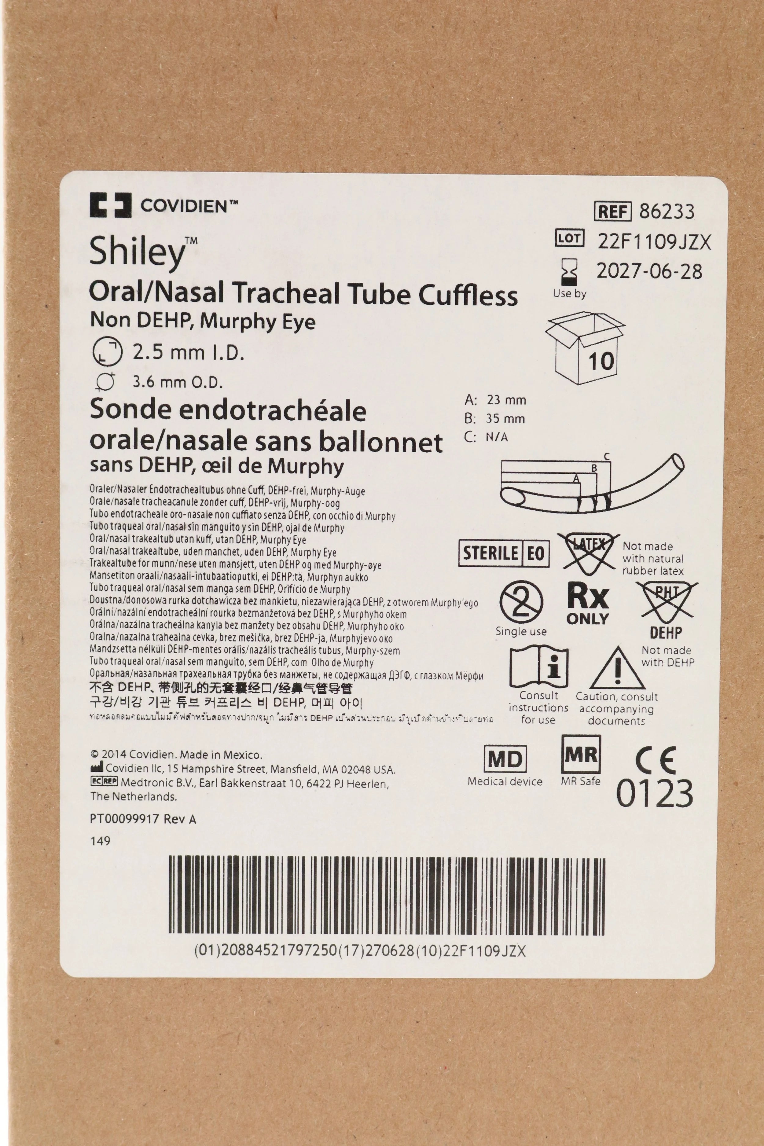 COVIDIEN | 86233 | IN-DATE | BOX OF 10 | SHILEY ORAL/NASAL ENDOTRACHEAL TUBE CUFFLESS, NON-DEHP, MURPHY EYE, 2.5MM