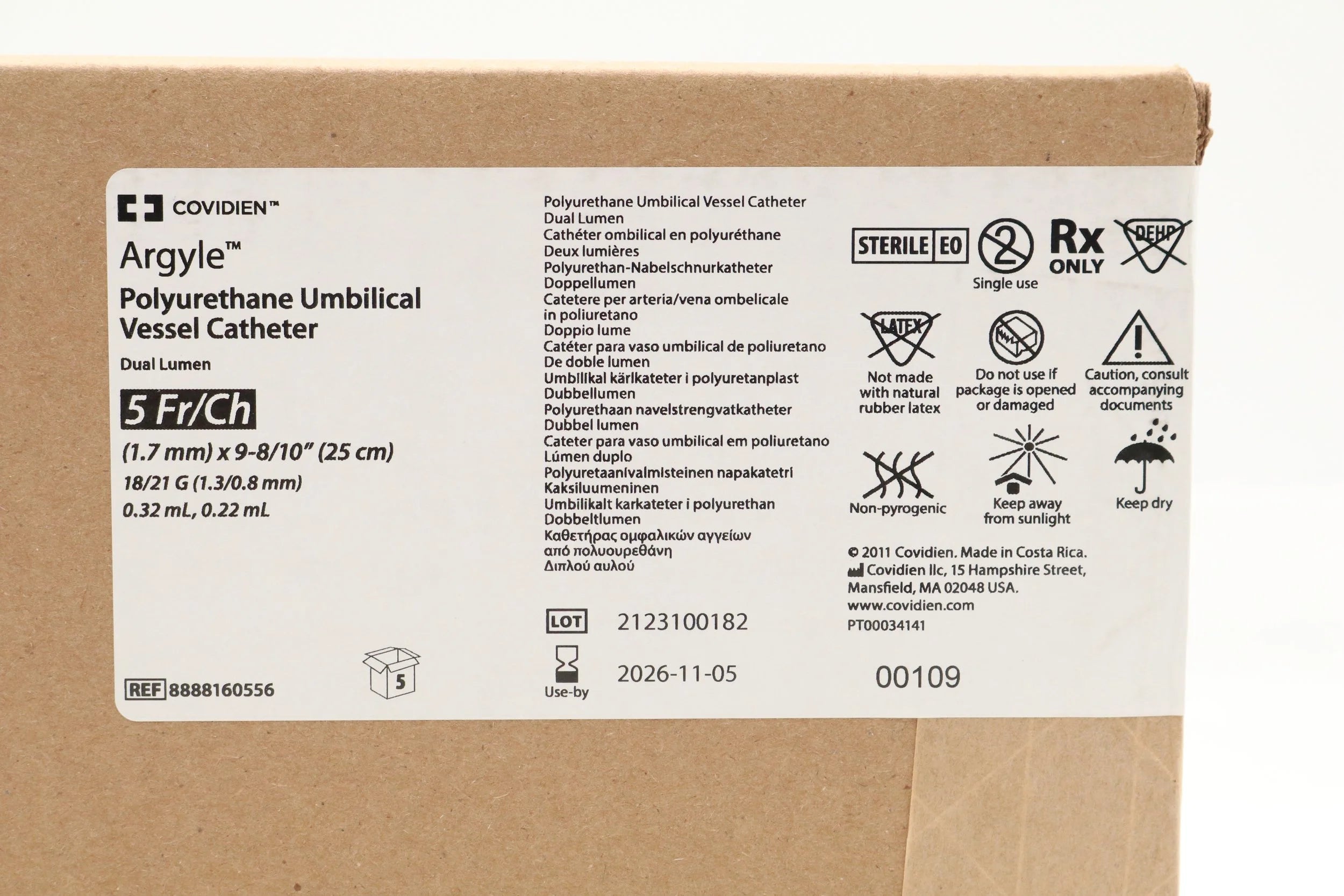 COVIDIEN | 8888160556 | BOX OF 5 | ARGYLE UMBILICAL VESSEL CATHETER DUAL LUMEN 5 FR/CH 15" 18/21 G