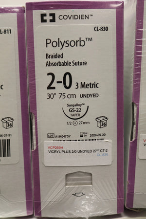 Covidien | CL-830 | Polysorb Braided Absorbable Suture 2-0 3 Metric 30" 75cm UNDYED