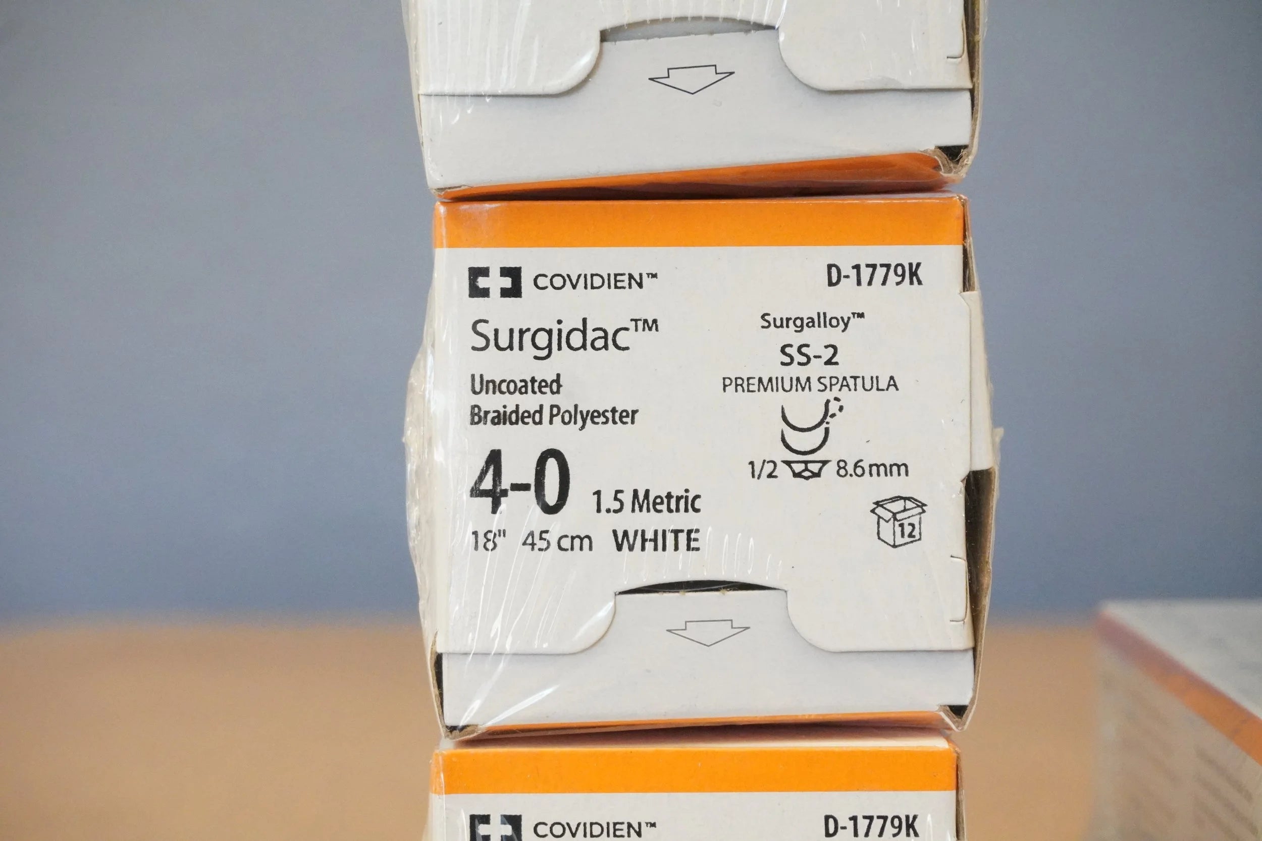 COVIDIEN | D-1779K | PACK of 12/pc | Surgidac Uncoated Braided Polyester 4-0 1.5 Metric 18" 45cm WHITE