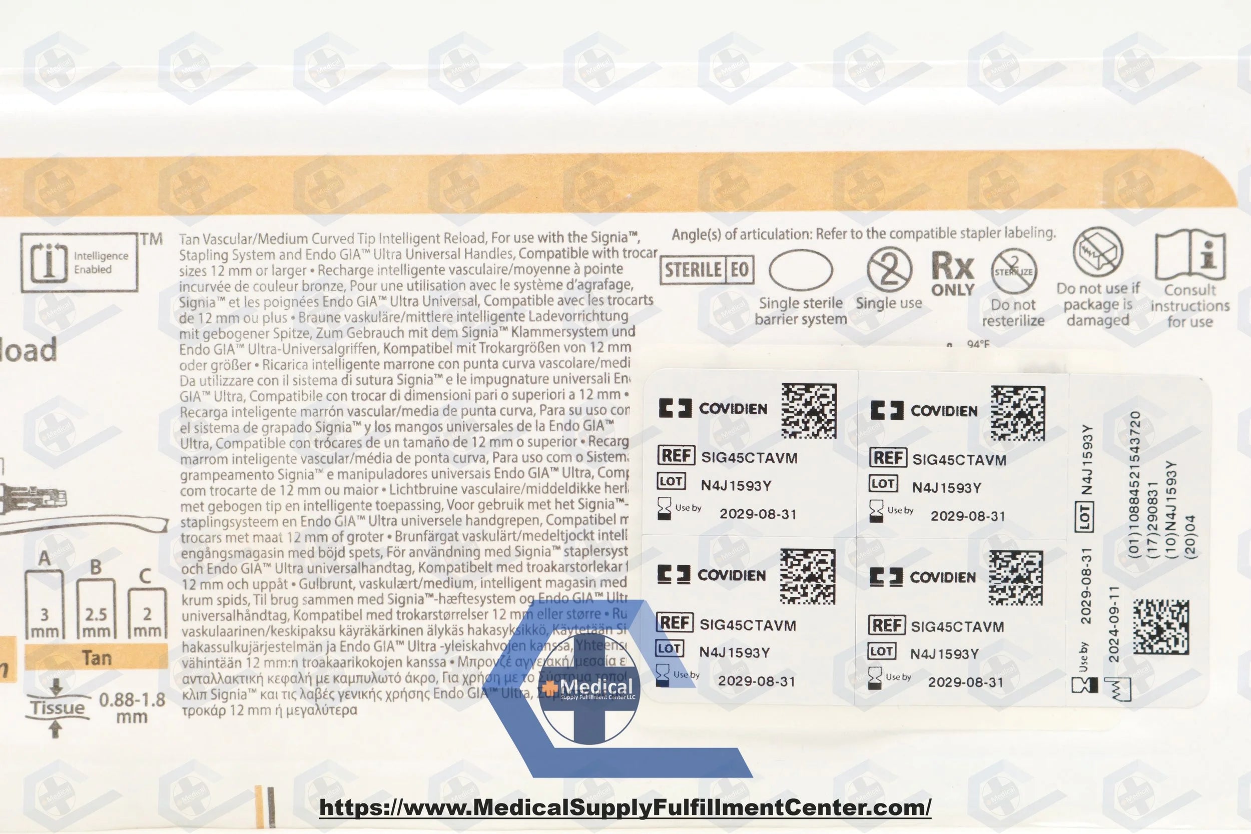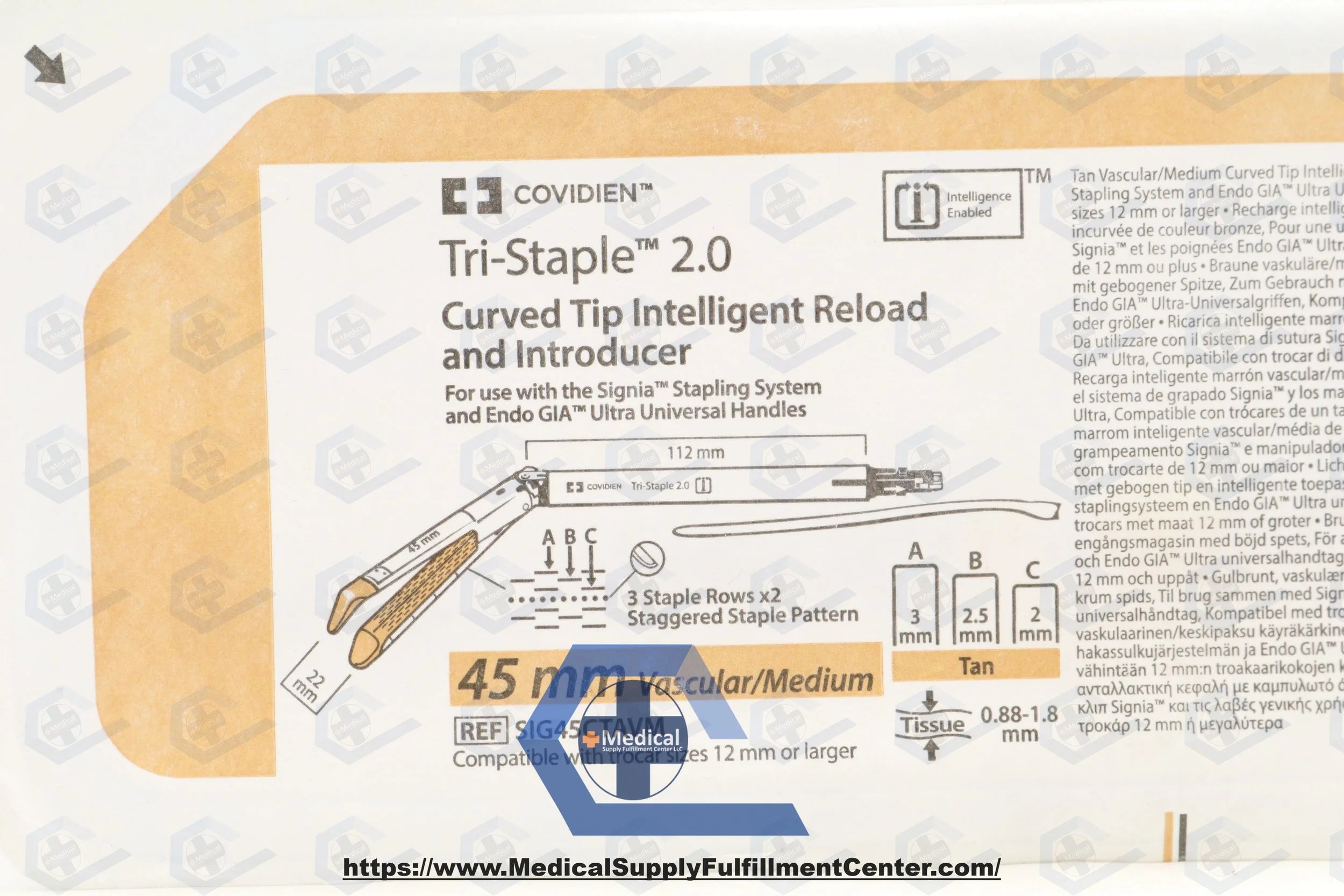 Covidien | SIG45CTAVM | In Date | Eaches | Reload, 45 mm Size, Tan, Titanium (Staples), Curved TipVascular/Medium, Tissue Thickness, Tri-Staple Staple Technology, Sterile, Single-Use