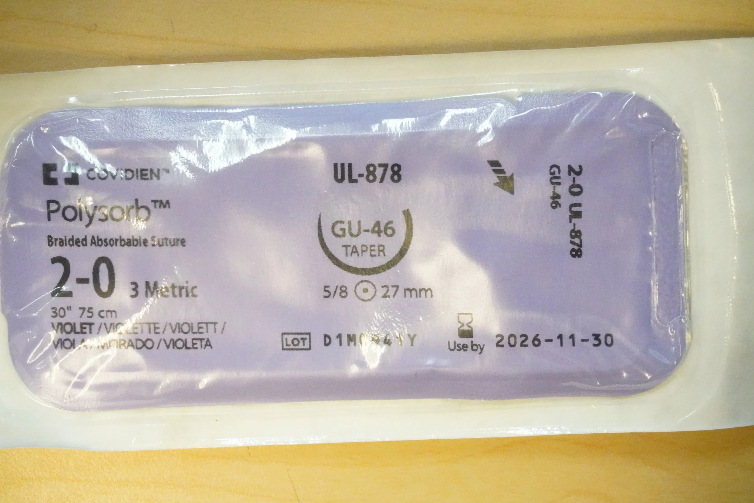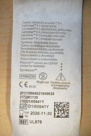 COVIDIEN UL-878 PACK of 36/pc Polysorb Braided Absorbable Suture 2-0 3 Metric 30" 75cm VIOLET