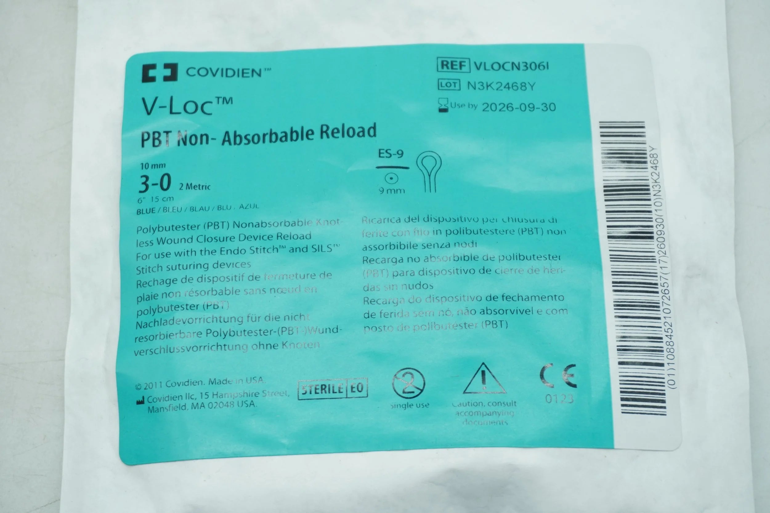 Covidien | VLOCN306L | SUTURE Size 3-0, 6 in. Length, Blue, Polybutester, Uncoated, Non-Absorbable, Barbed Monofilament, ES-9 Needle, Sterile