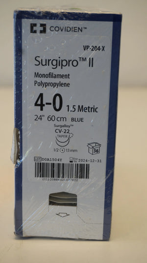 COVIDIEN | VP-204-X | SHORTDATE | PACK of 36/pc | Surgipro II Monofilament Polypropylene 4-0 1.5 Metric 24" 60cm BLUE