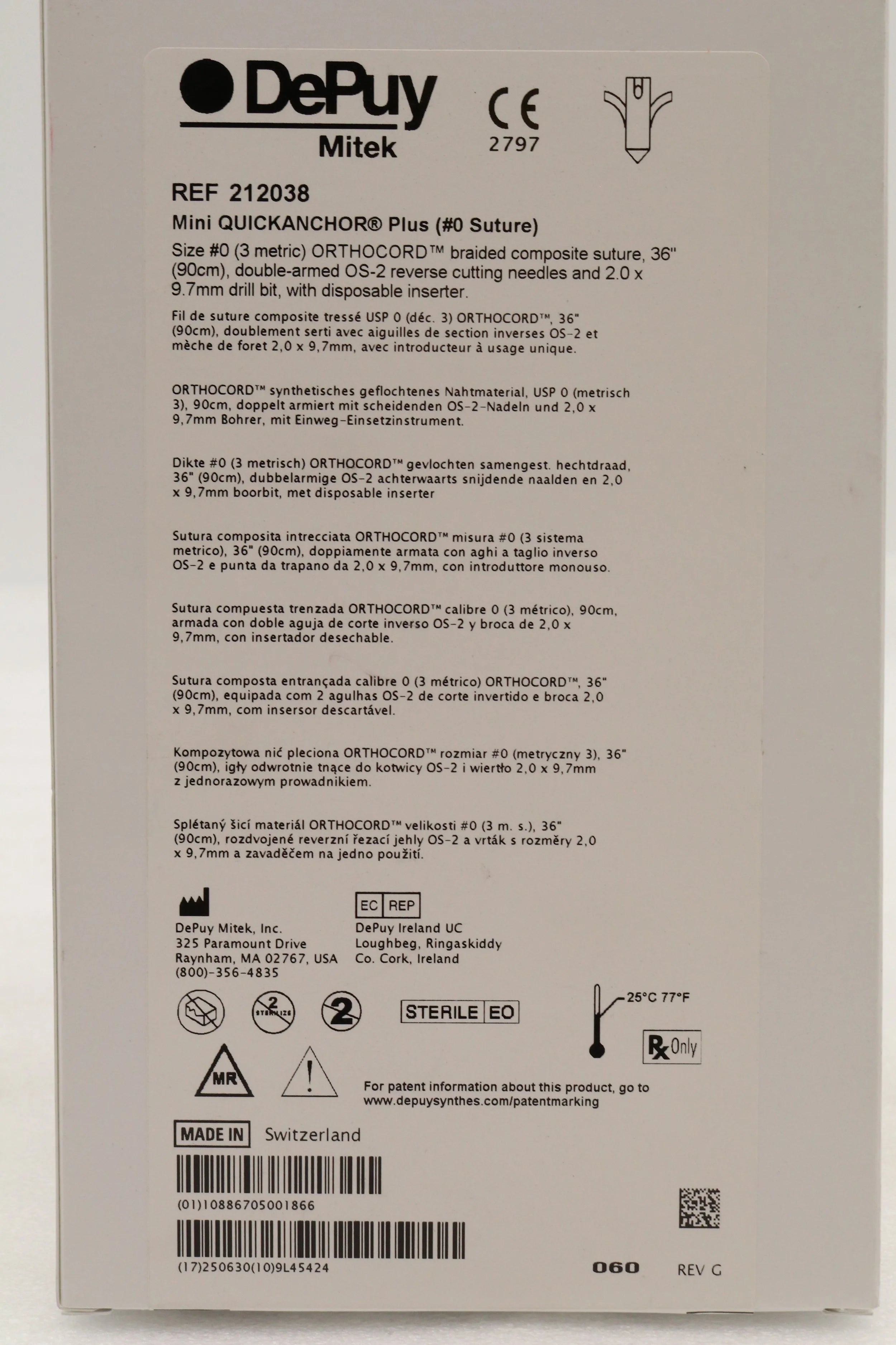 DePuy Mitek | 212038 | SHORT DATE | EACHES | Orthocord Mini QuickAnchor Plus #0 Suture – Size #0 – 2.0 x 9.7mm Drill Bit