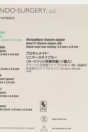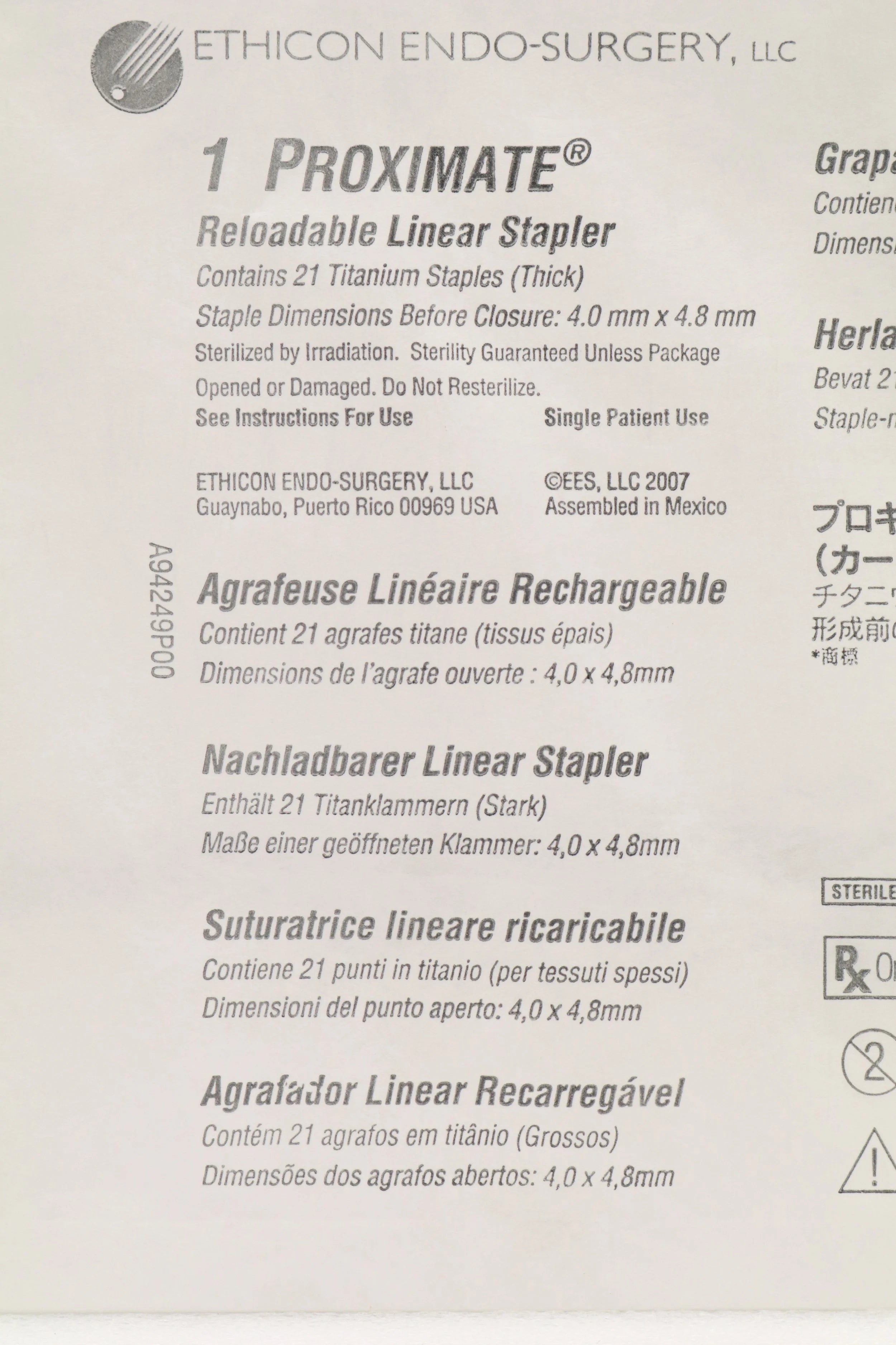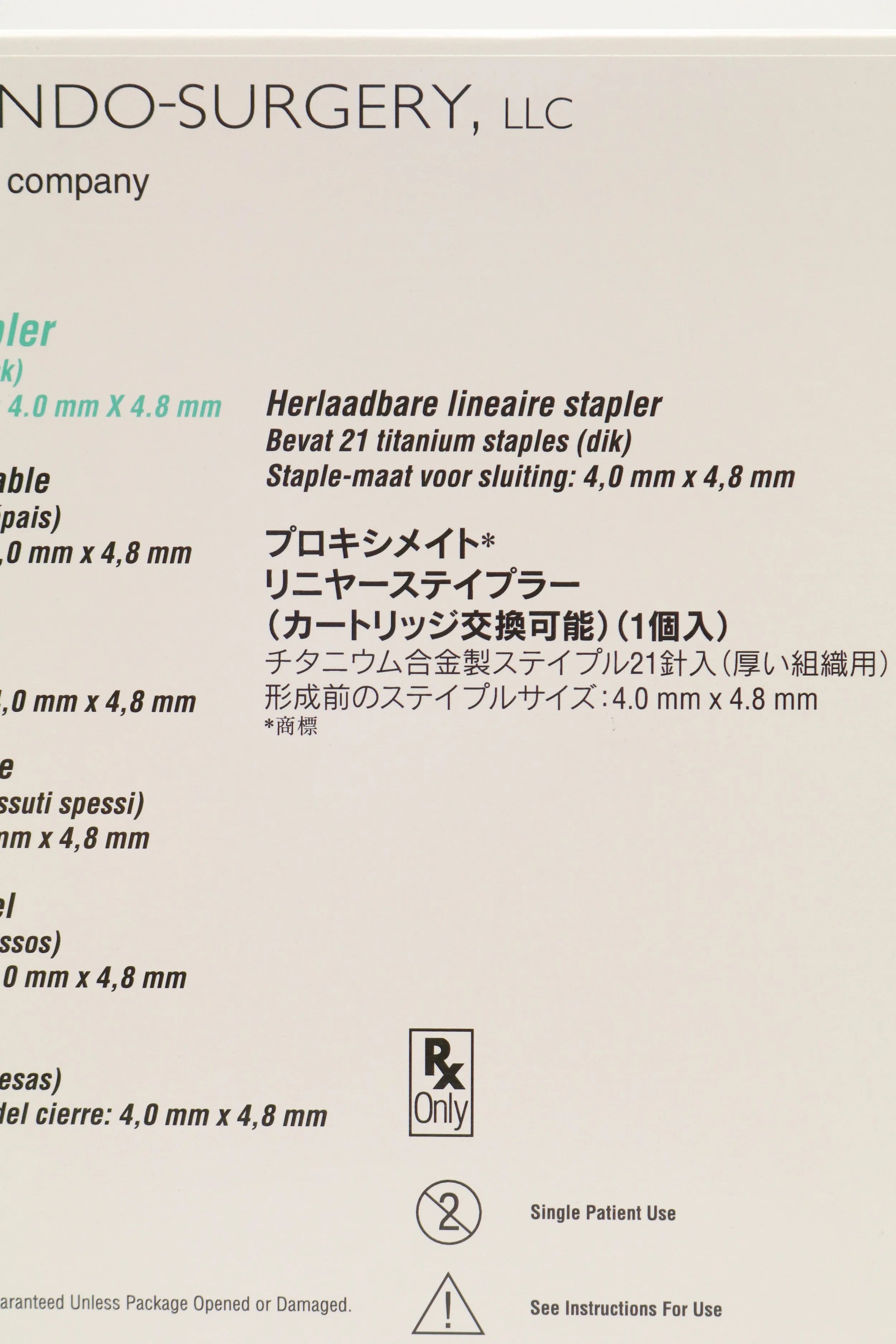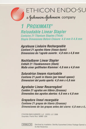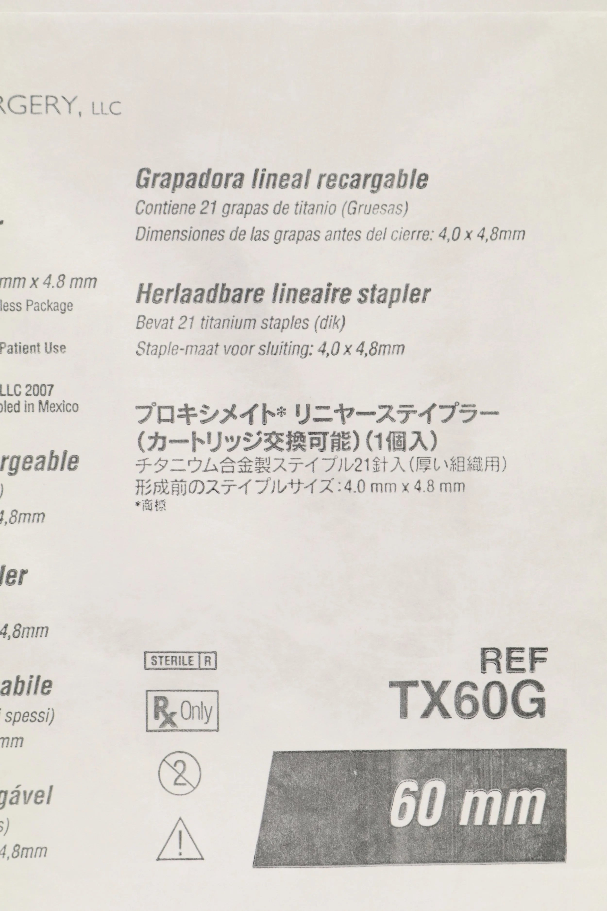 ETHICON TX60G PROXIMATE RELOADABLE 60MM LINEAR STAPLER, 21 TITANIUM STAPLES (THICK), DIMENSIONS BEFORE CLOSURE: 4.0MM X 4.8MM