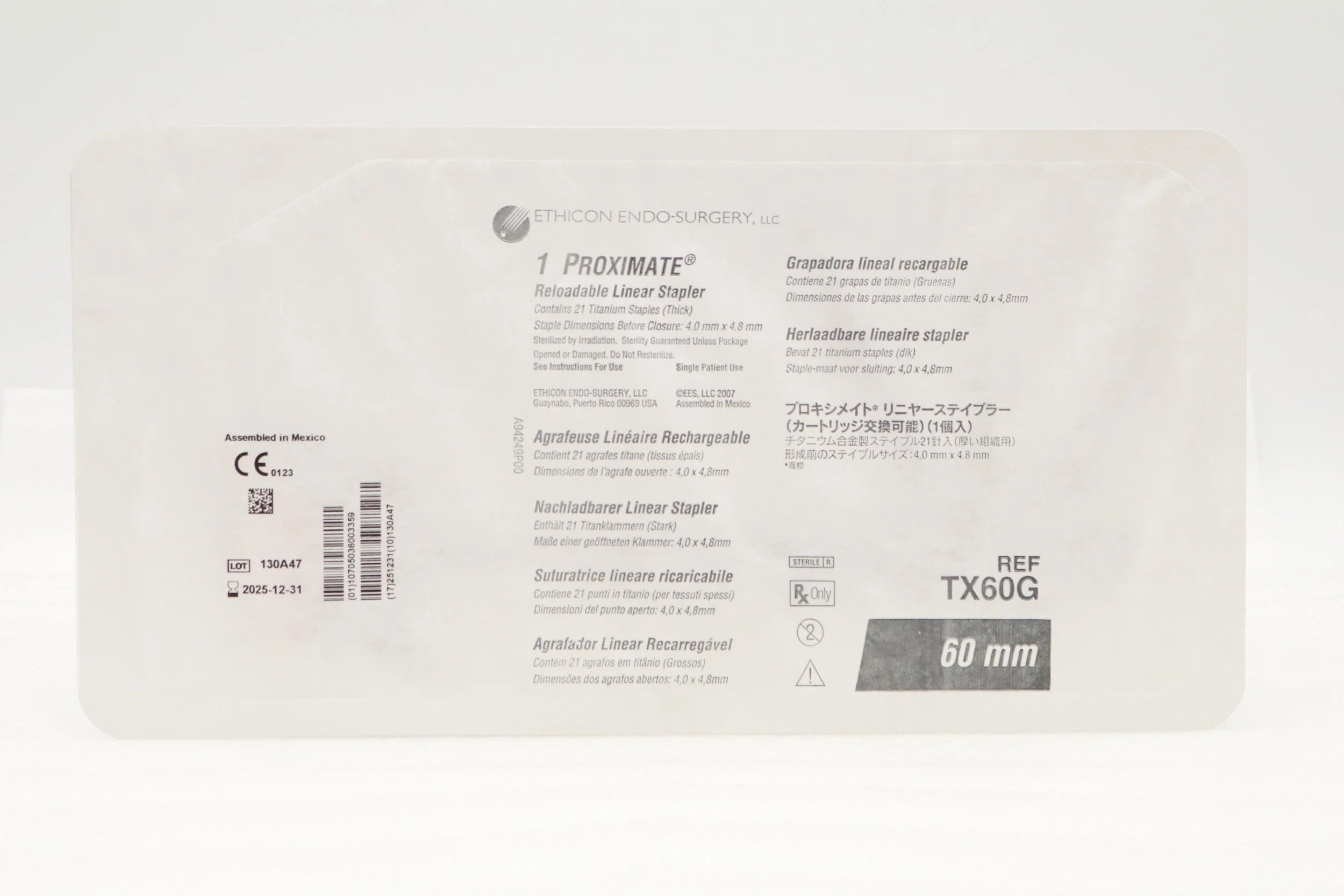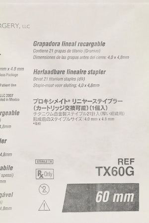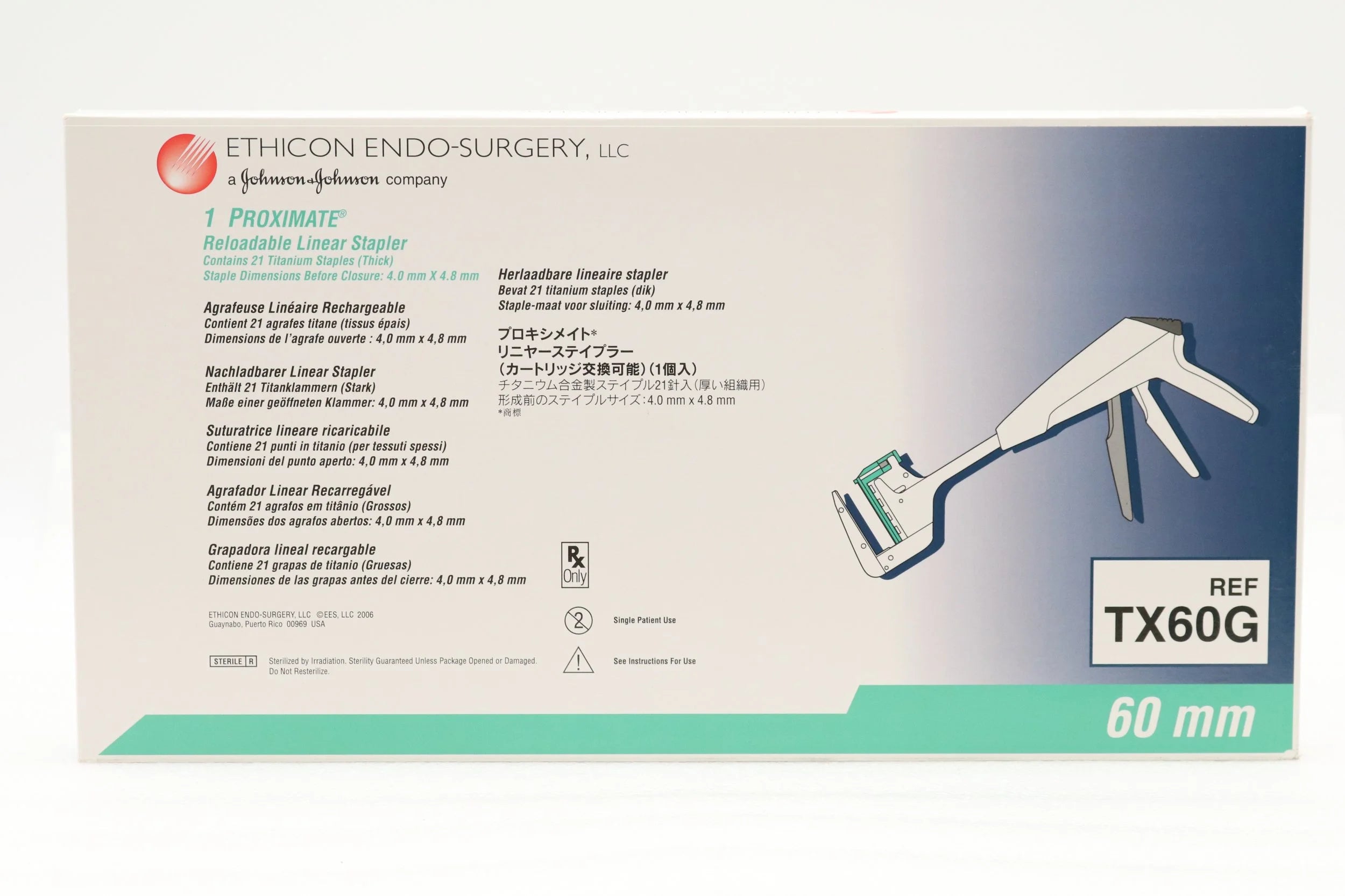 ETHICON | TX60G | SHORT DATE | EACHES | PROXIMATE RELOADABLE 60MM LINEAR STAPLER, 21 TITANIUM STAPLES (THICK), DIMENSIONS BEFORE CLOSURE: 4.0MM X 4.8MM