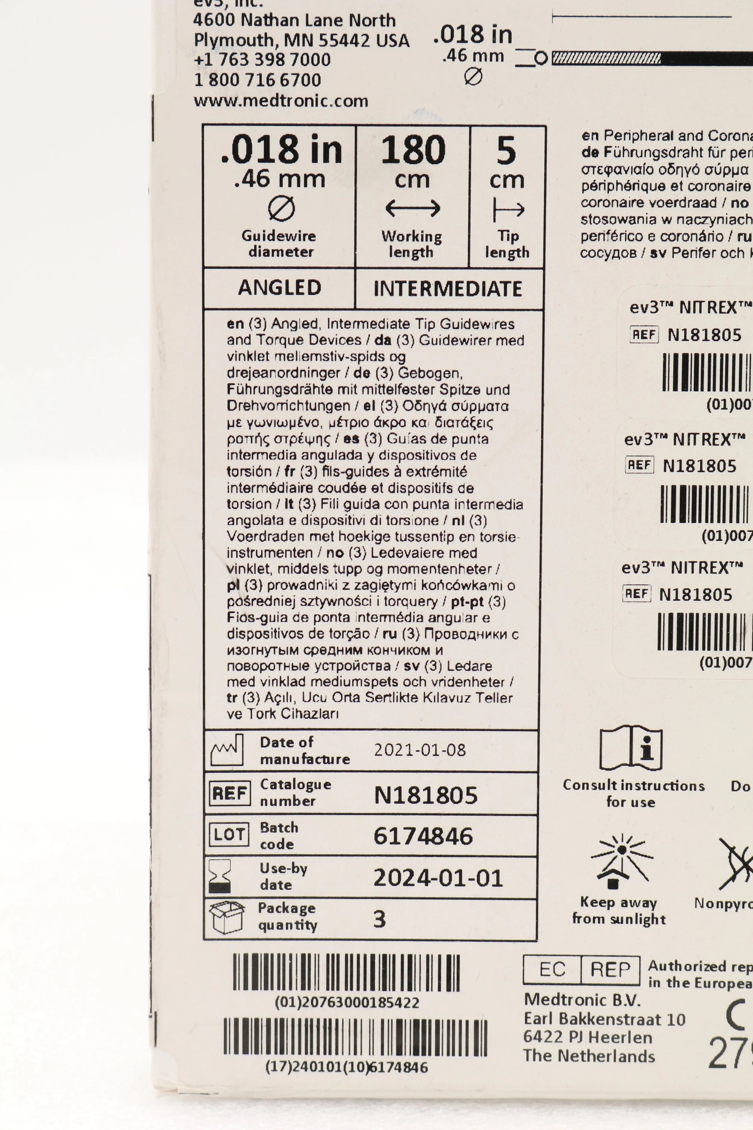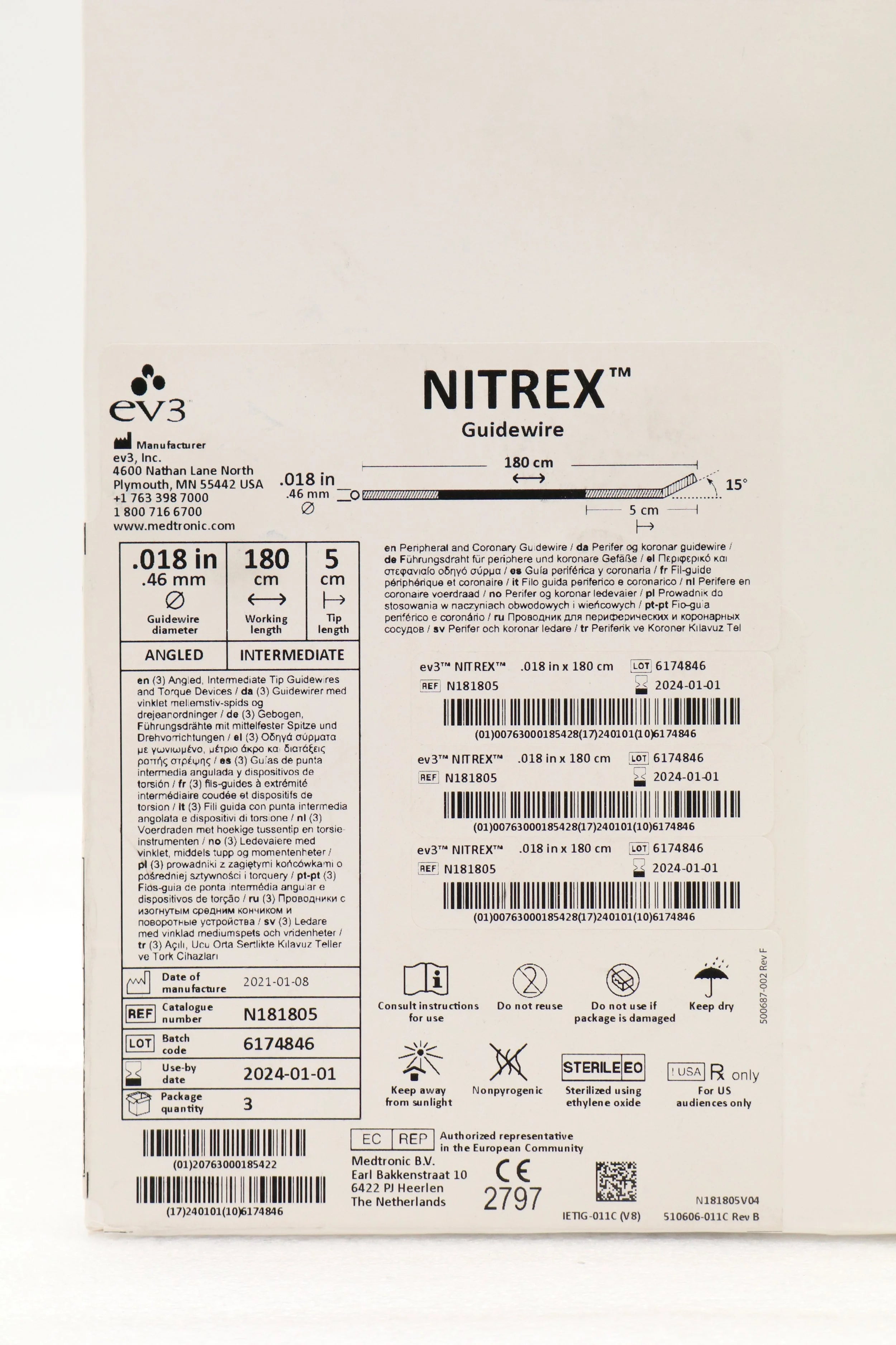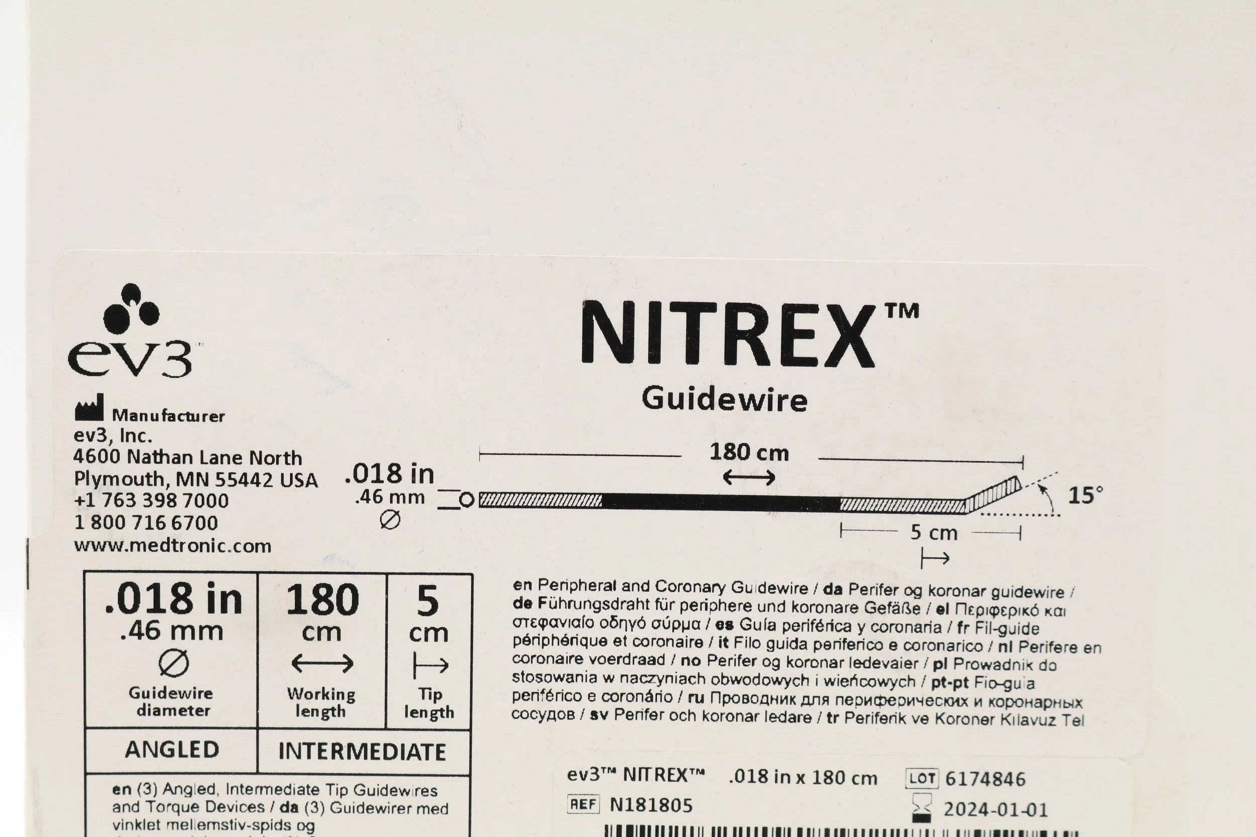 EV3 | N181805 | SHORT DATE | BOX OF 3 | Nitrex Guidewire: 0.018" x 180cm, Angled