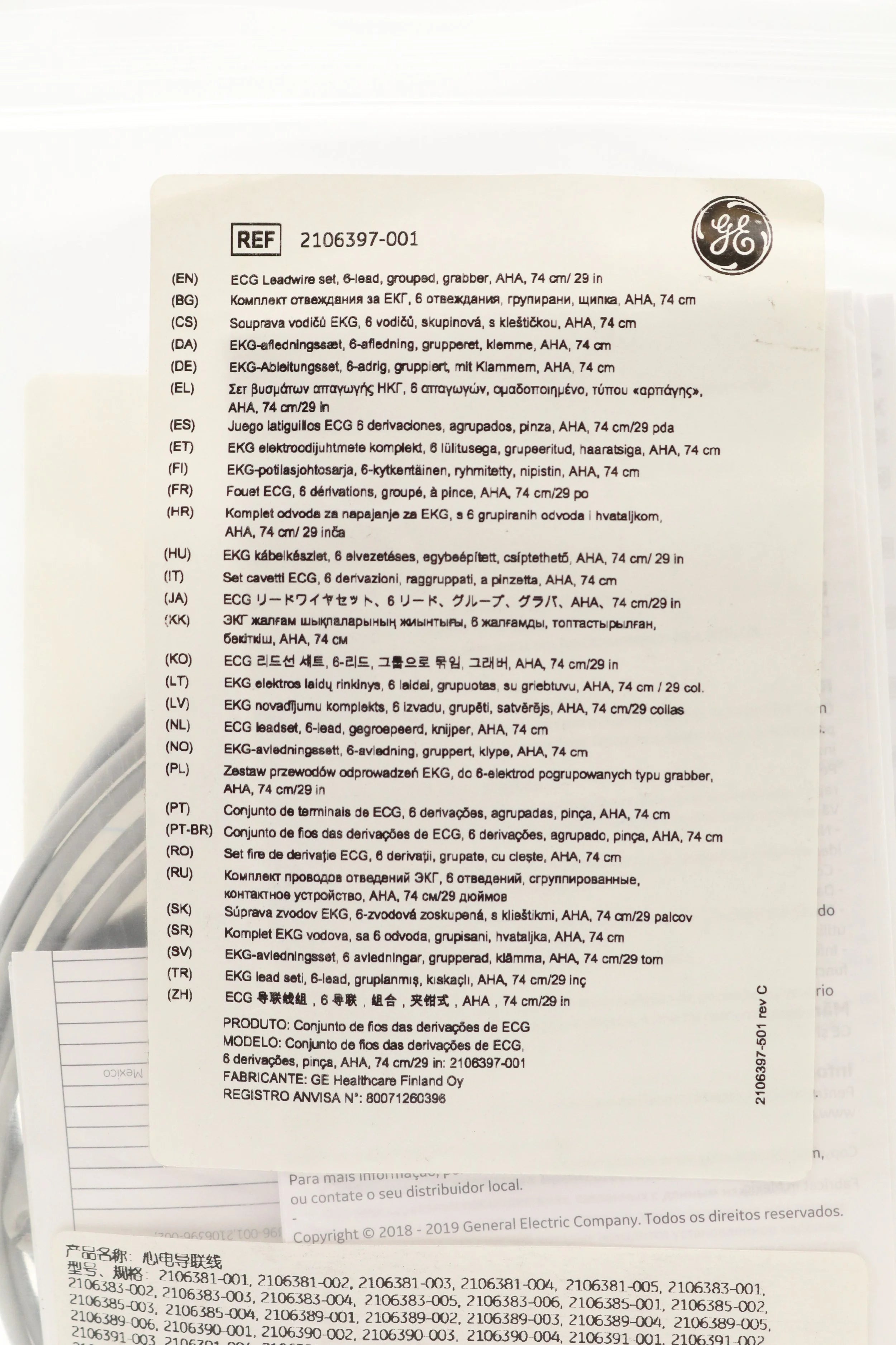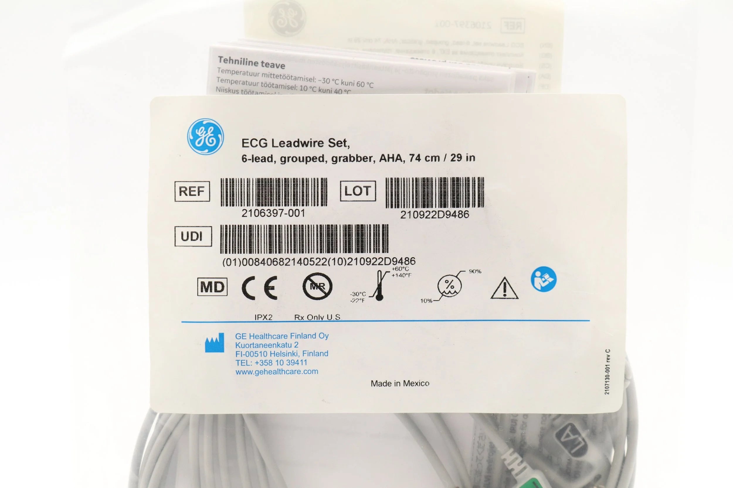 GE Healthcare | 2106397-001 | NO-DATE | EACHES | ECG Leadwire set, 6-lead, grouped, grabber, AHA, 74 cm/29 in