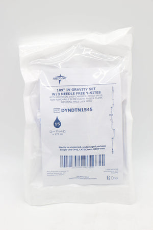 Medline DYNDTN1545 Box of 50 109" I.V. Administration Set I.V. Administration Set with Universal Drip Chamber, Check Valve, 3 Needle-free Y-Sites, Non-Removable Side Clamp, Roller Clamp, Rotating Male Luer Lock, Gravity Use Only