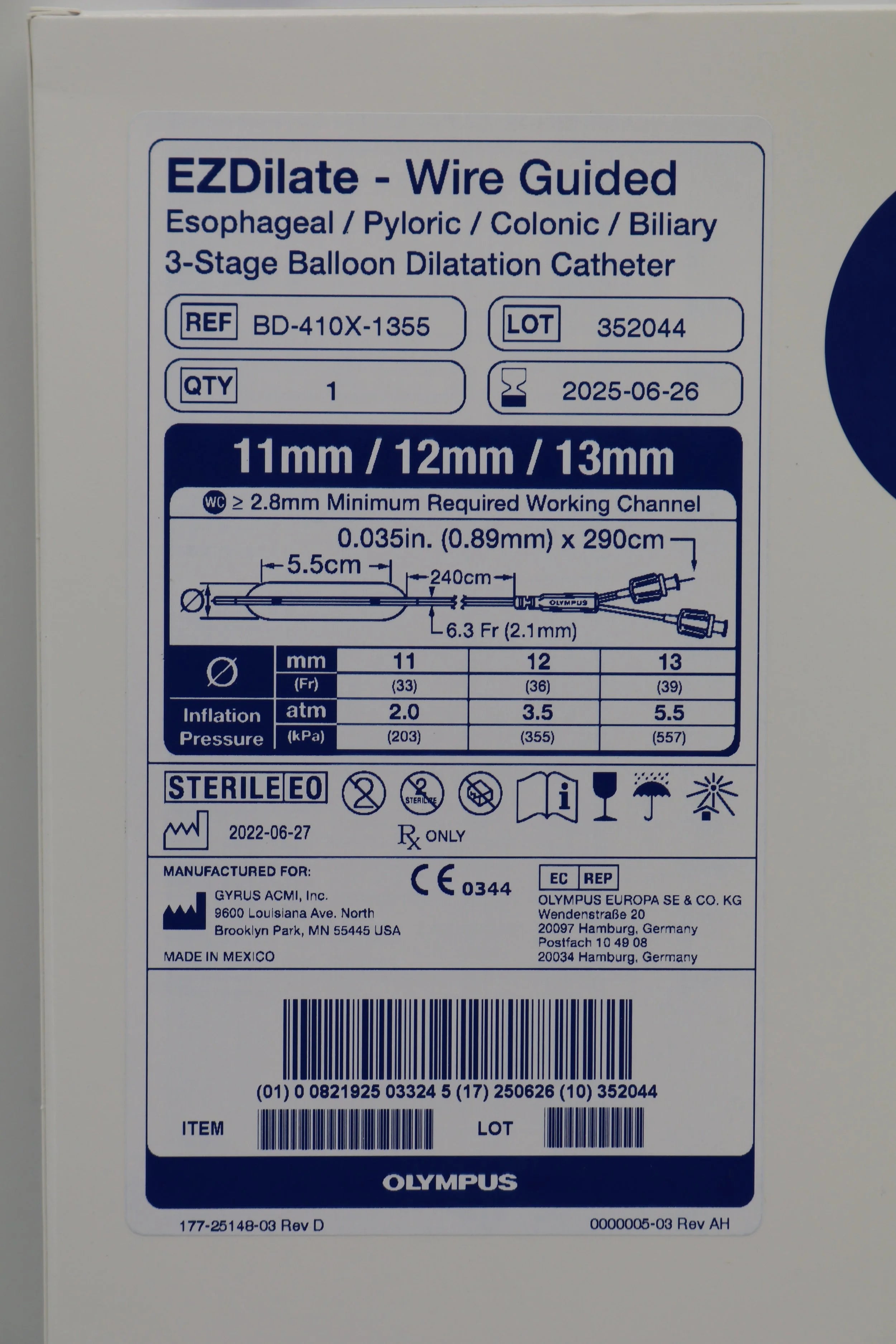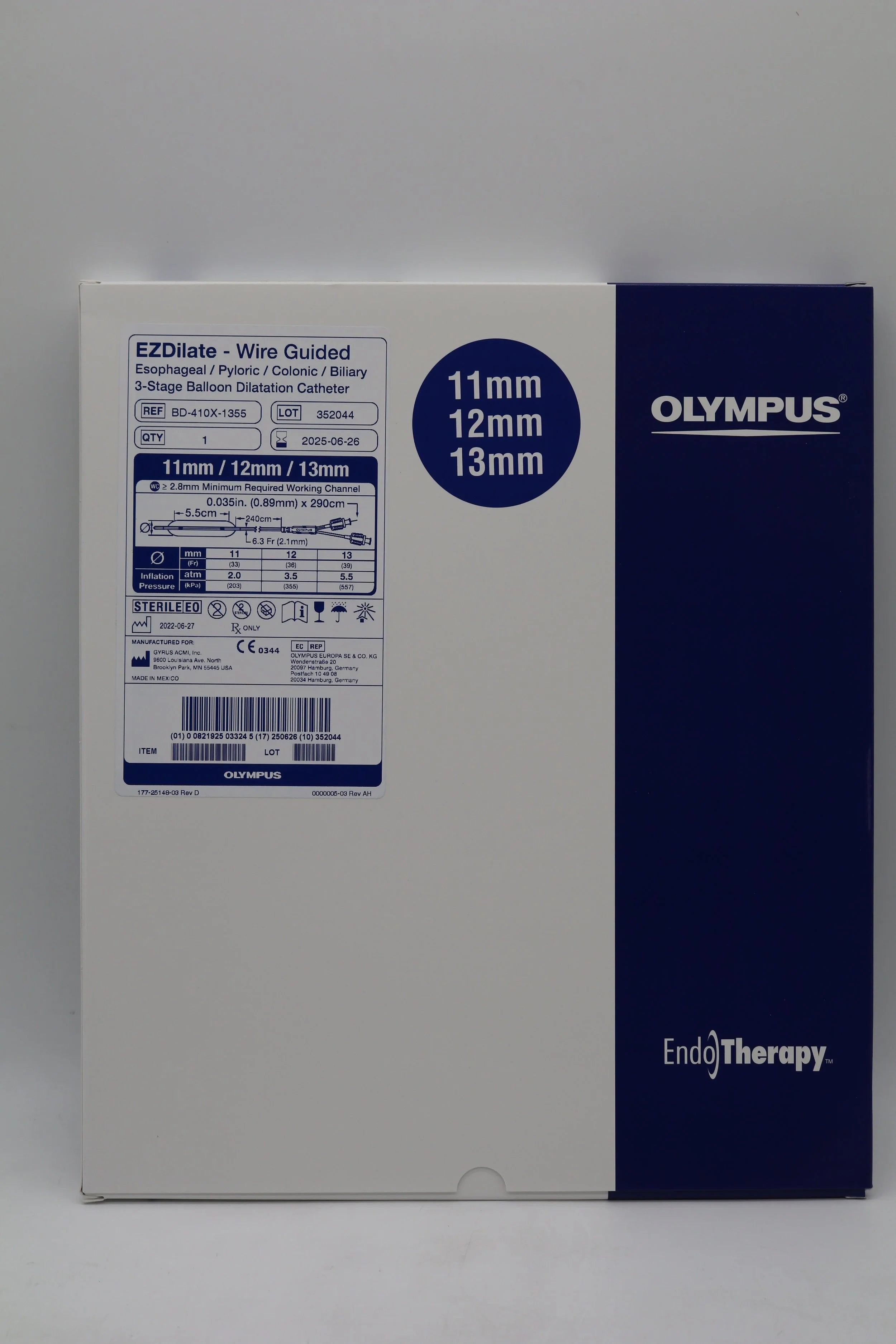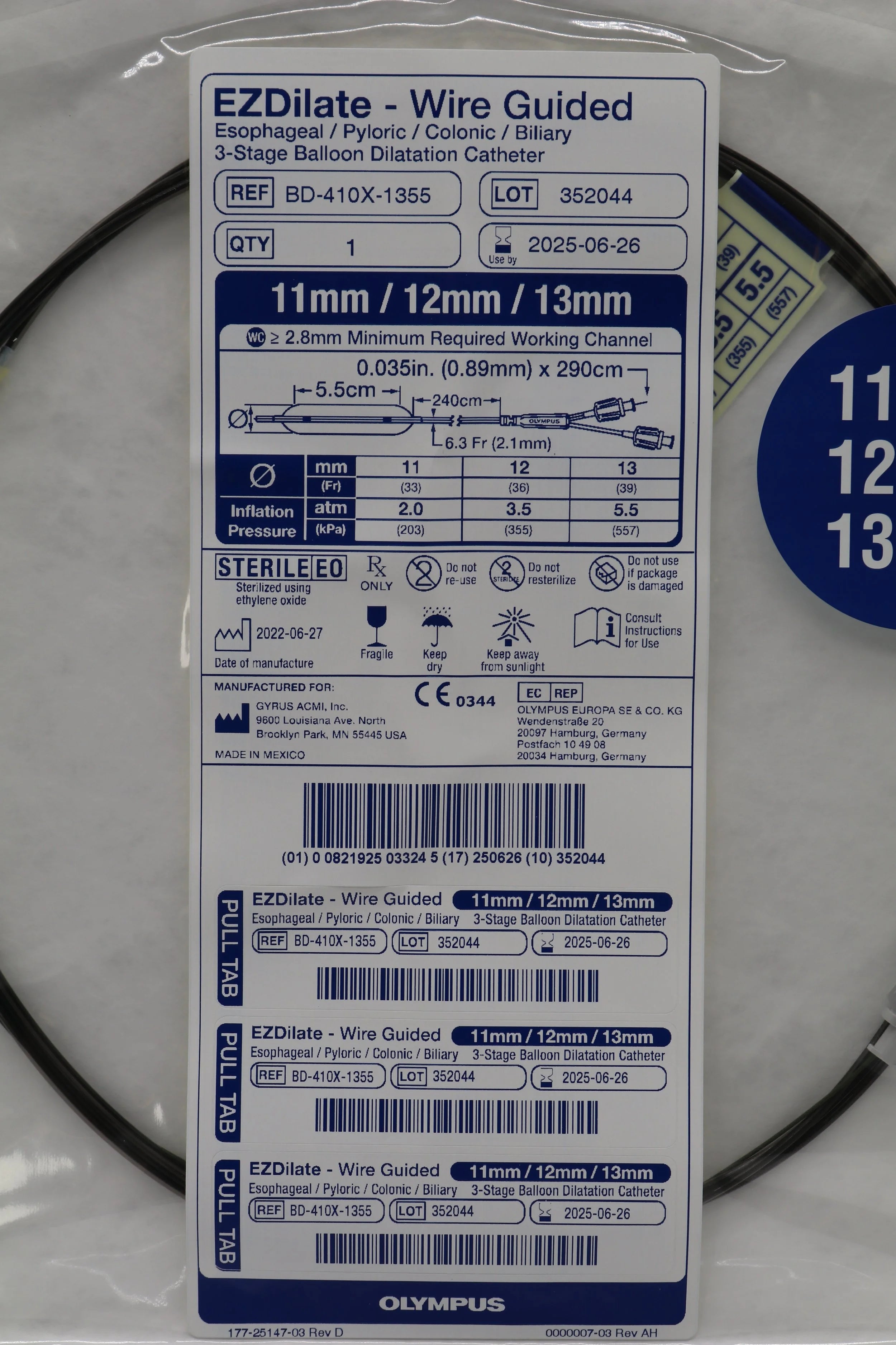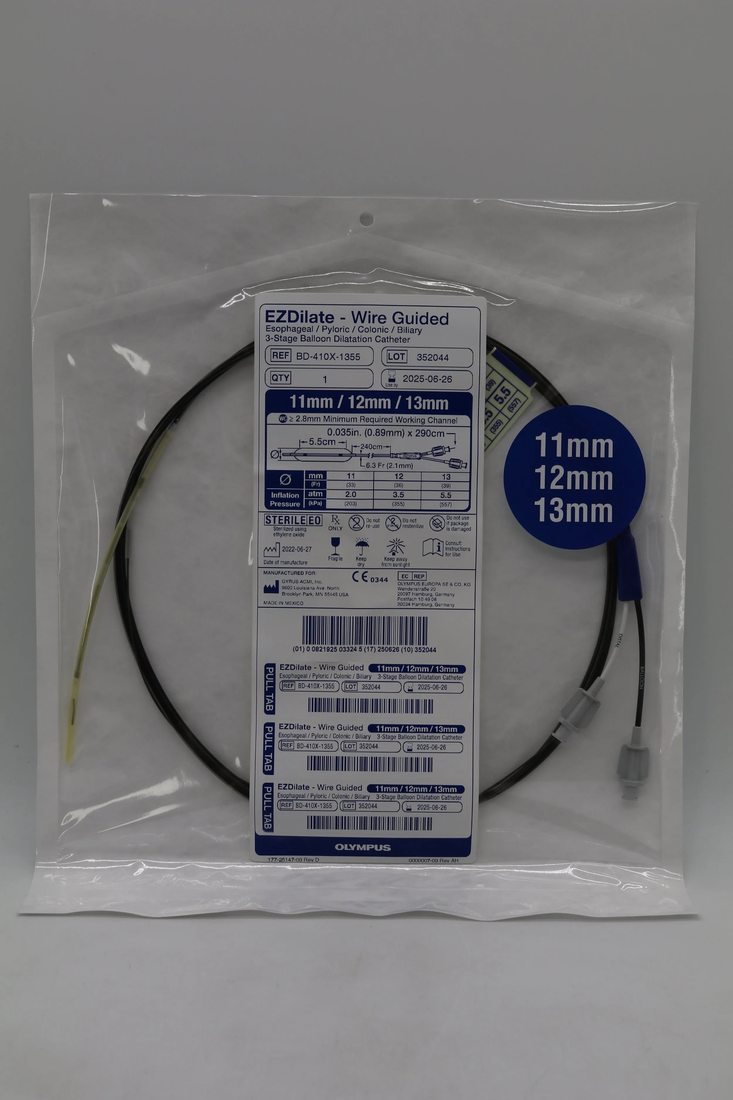 Olympus BD-410X-1355 EZDilate Wire Guided Esophageal Pyloric Colonic Biliary 3-Stage Balloon Dilatation Catheter 11mm 12mm 13mm