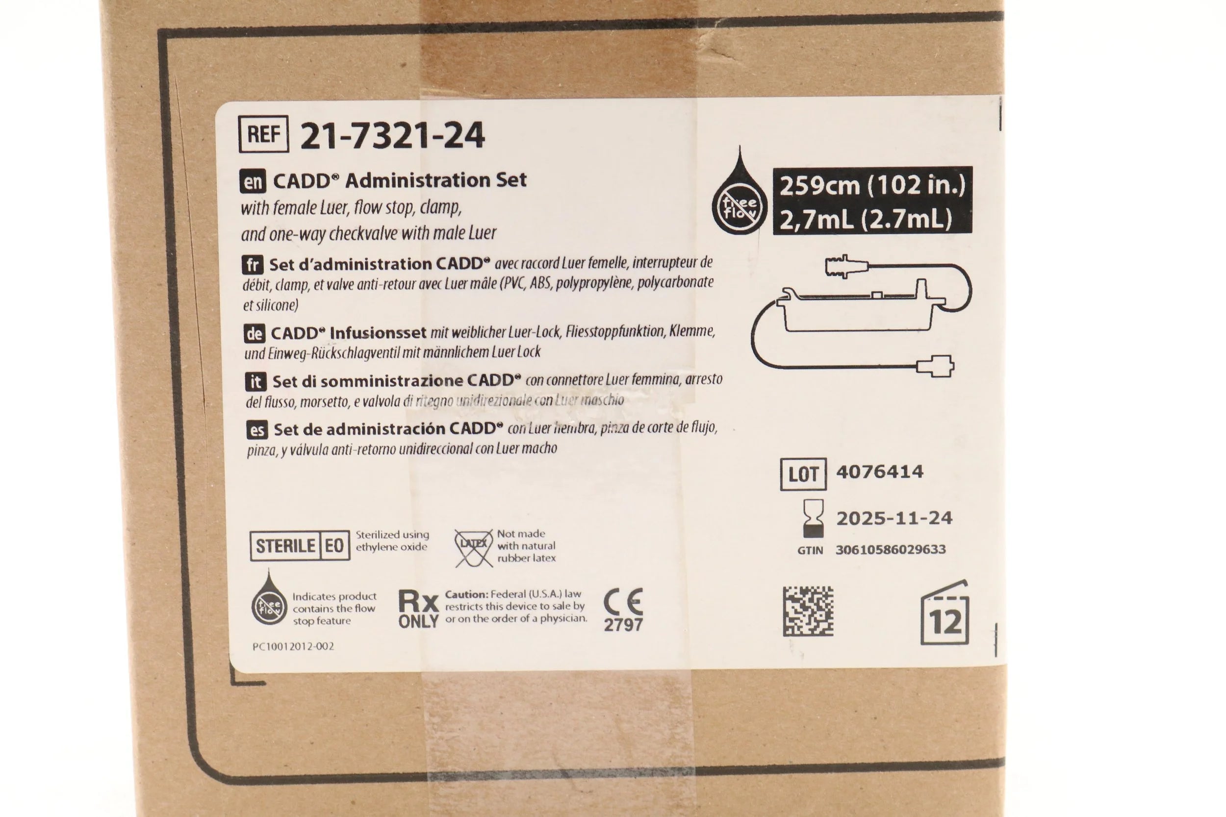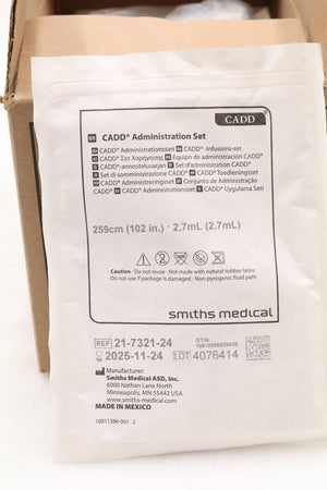 Smiths Medical | 21-7321-24 | SHORT DATE | BOX OF 12 | CADD Administration Sets - CADD Flow Stop 102" Standard Administration Set with Female Luer, Clamp and 1-Way Check Valve with Male Luer