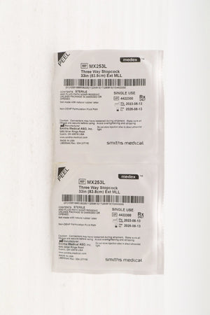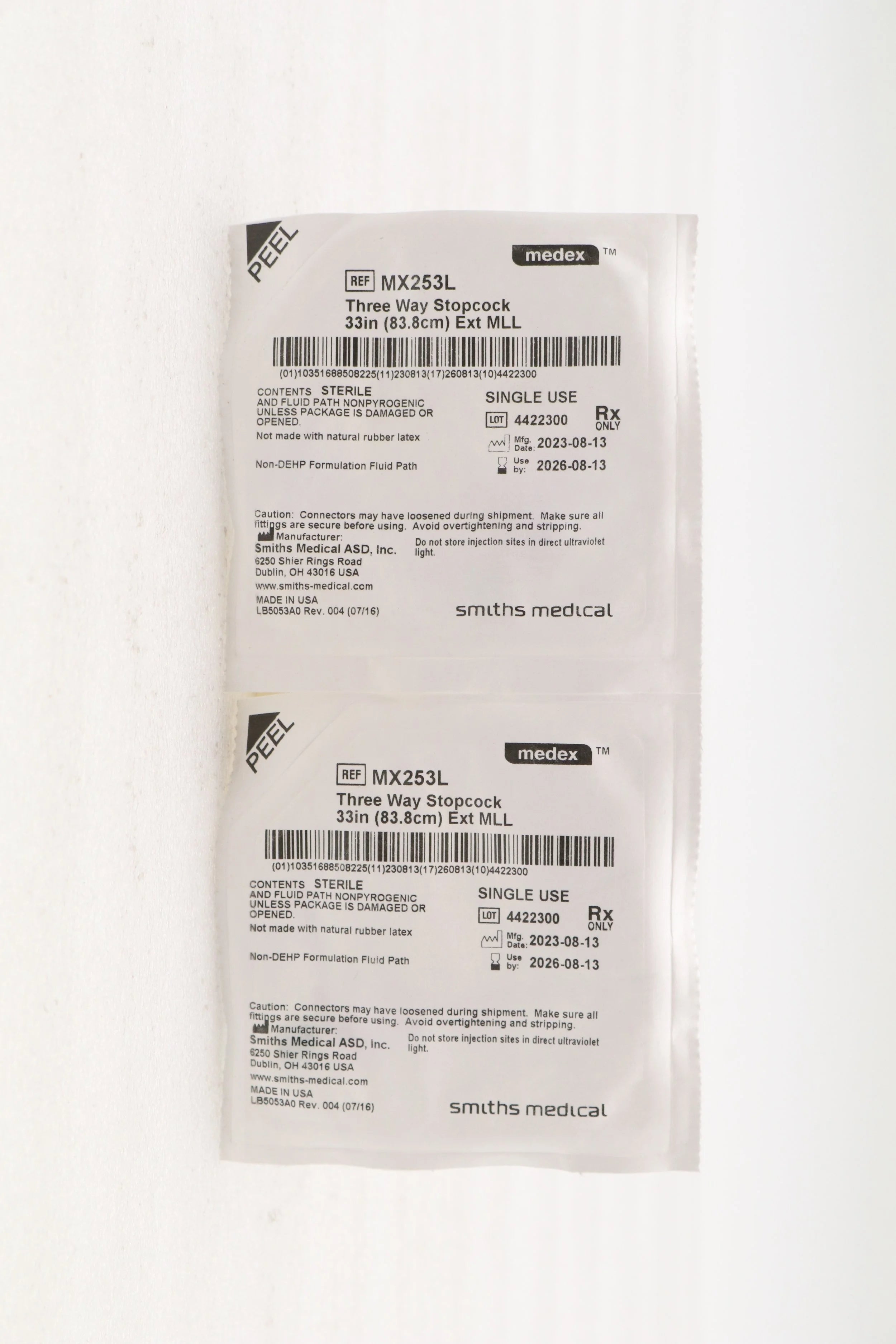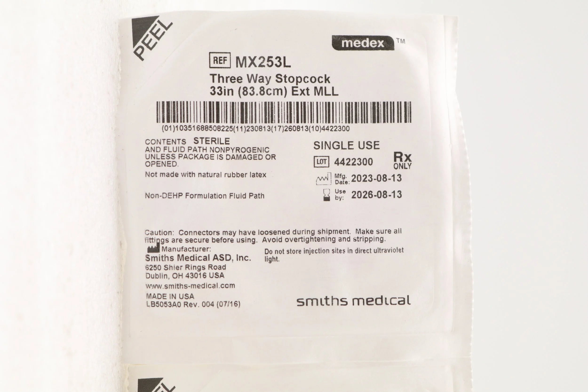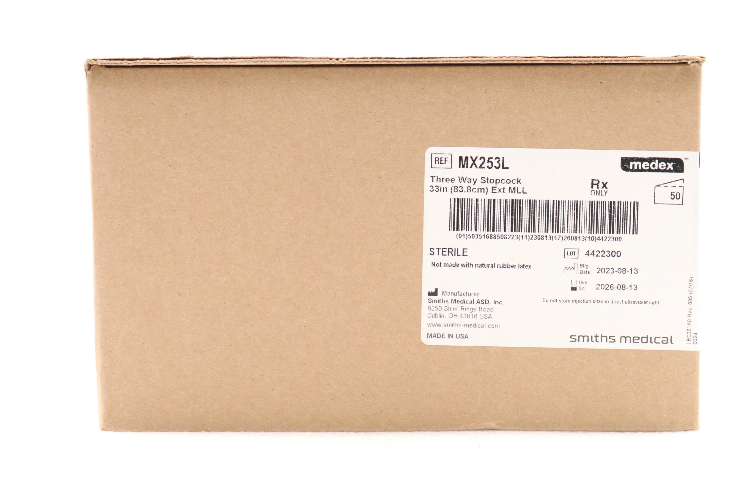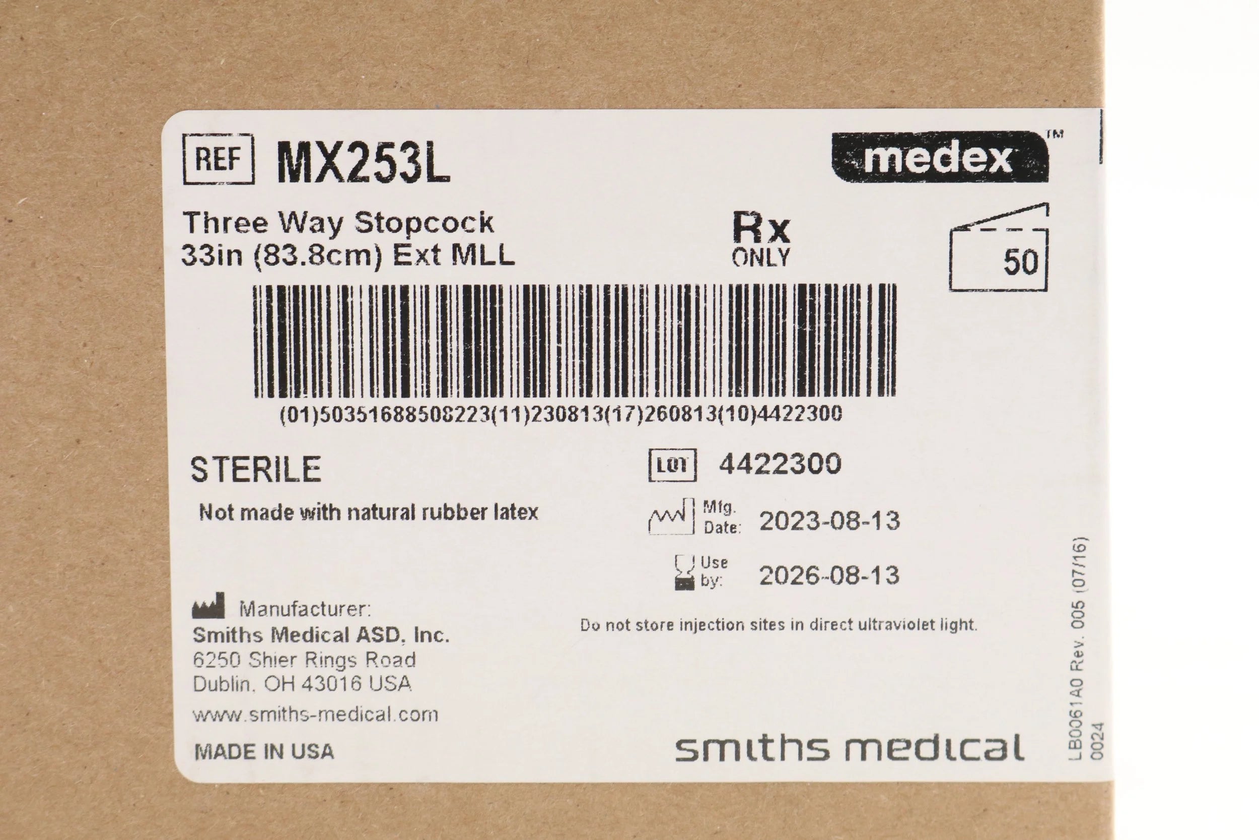 SMITHS MEDICAL | IN-DATE | MX253L | BOX OF 50 | 3-WAY ANESTHESIA STYLE STOPCOCK STANDARD BORE EXTENSION WITH INJECTION SITE, 3.9ML, 35IN