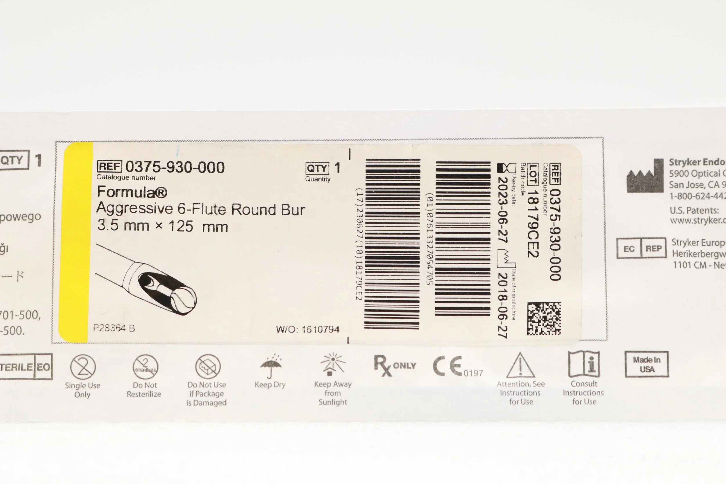 STRYKER 0375-930-000 EXPIRED Arthroscopic Shaver Blade Formula Aggressive 6-Flute Round Bur 3.5mm x 125mm