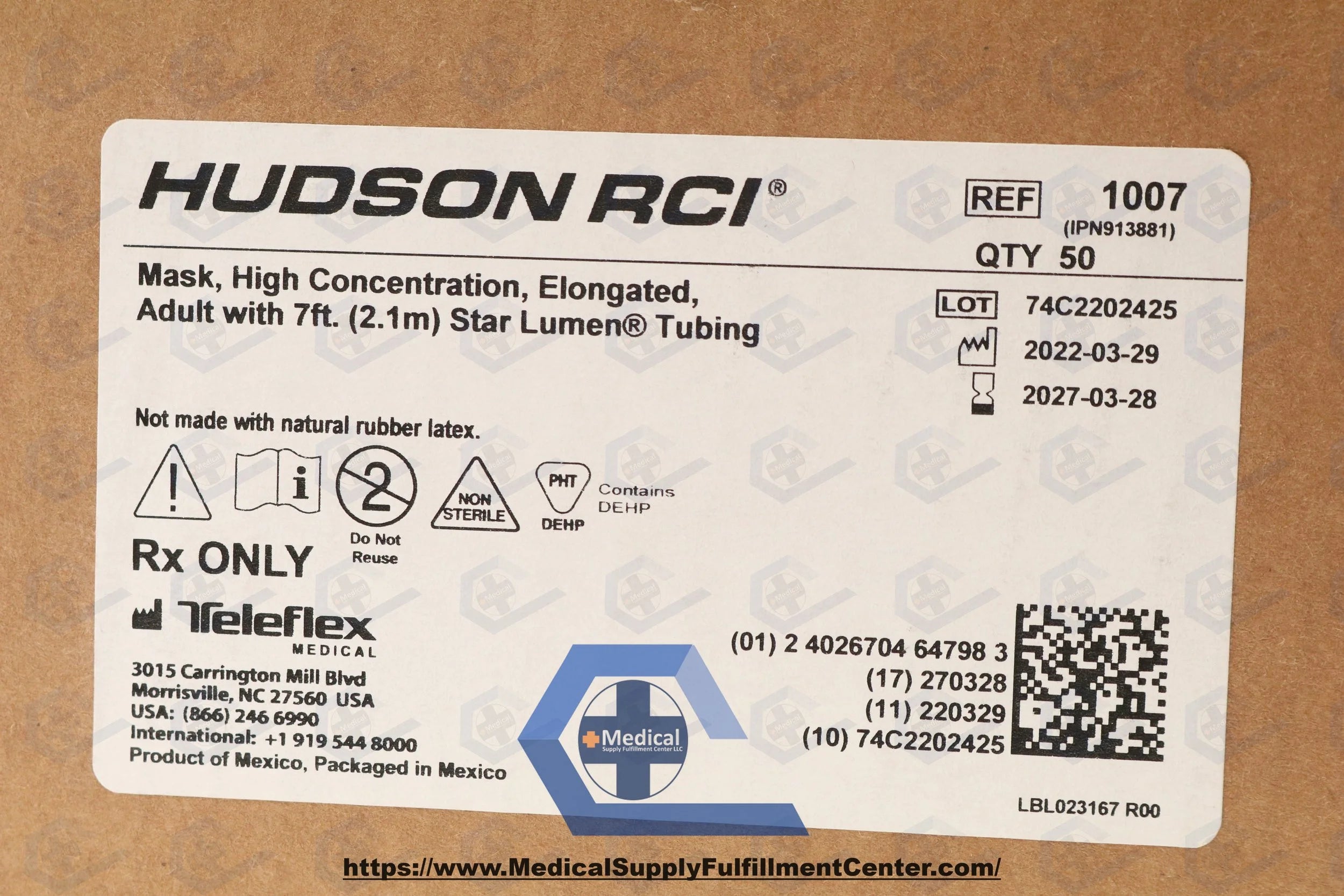 TELEFLEX | 1007 | INDATE | BOX OF 50 | Oxygen Masks - High Concentration Oxygen Mask, Adult, Elongated