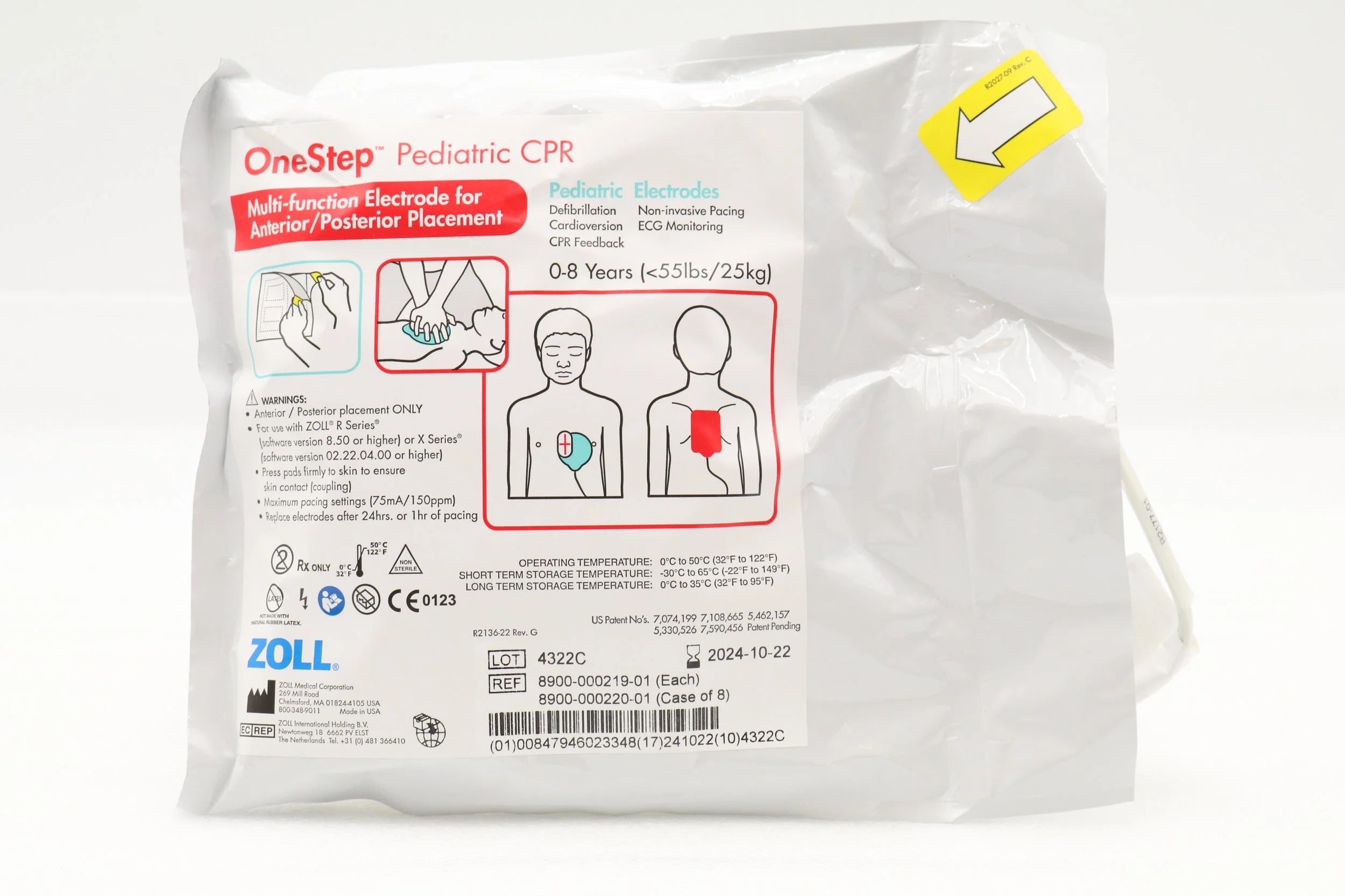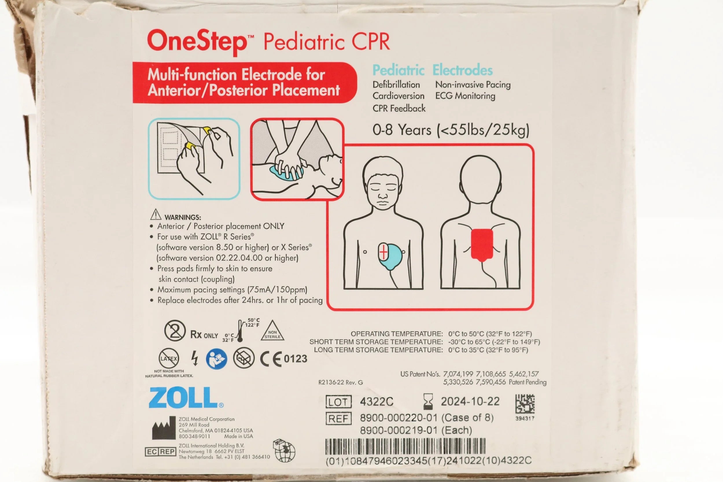 ZOLL 8900-000220-01 SHORT DATE CASE OF 8 OneStep Pediatric CPR Multi-Function Electrode for Anterior / Posterior Placement